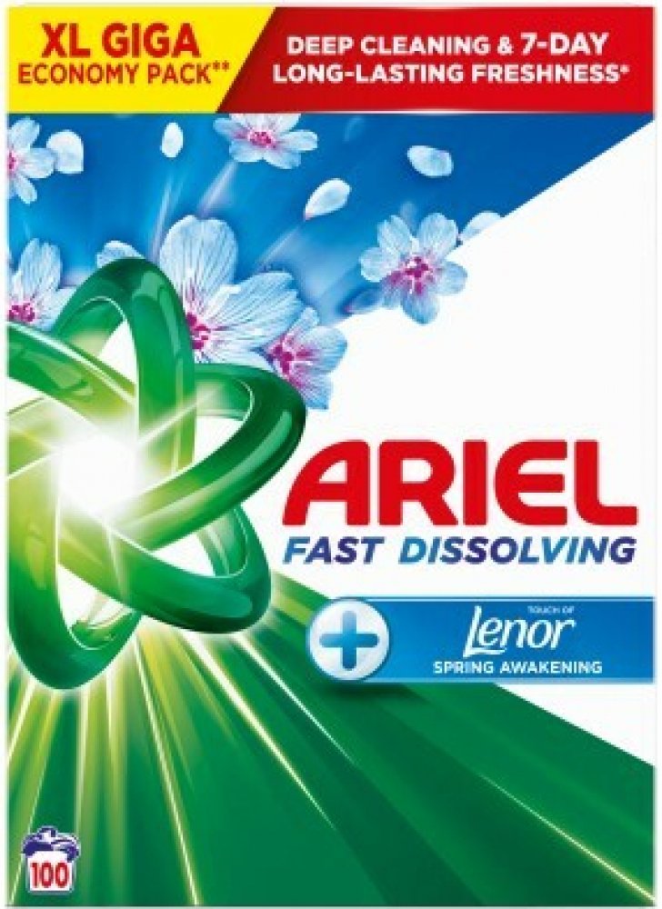 Univerzální prací prášek dodá prádlu svěží vůni Určen na barevné i bílé prádlo Rychle se rozpouští a nezanechává zbytky na prádle Ochrání tkaniny Účinný již od teploty 30 °C Chrání proti vodnímu kameni S dotekem svěží vůně Lenoru Výhodné balení 100 praní, 5,5 kg Popis Ariel Touch of Lenor prací prášek odstraňuje i odolné skvrny díky tomu, že ...