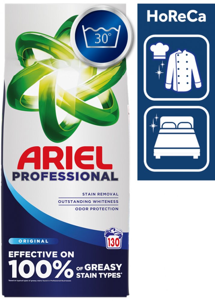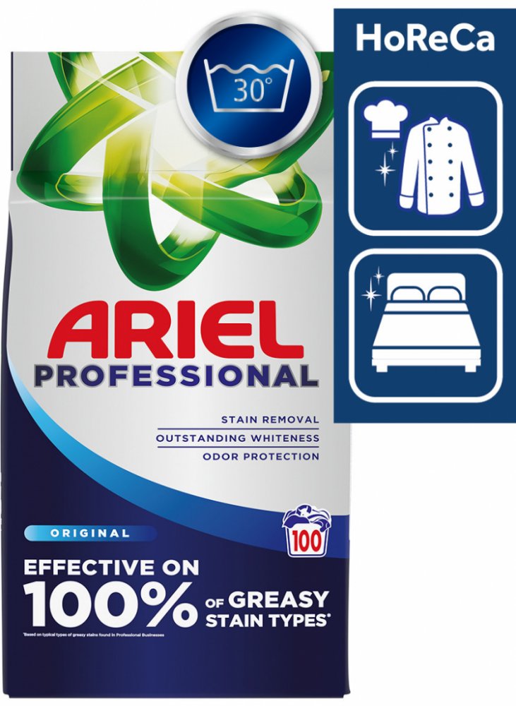 Prací prášek ARIEL Professional Original na barevné i bílé prádlo účinně odstraňuje odolné skvrny a nepříjemné zápachy i při nízkých teplotách od 30 °C. Lze jej používat i pro intenzivní praní při teplotě až 95 °C. Nabízí profesionální kvalitu HORECA - pro hotely, gastro zařízení a úklidové firmy. Lze jej použít na uniformy, ubrusy a jiné profesionálně a intenzivně používané textilie. Speciálně vy...