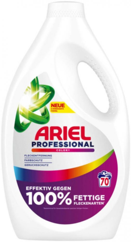 Popis Ariel Professional Colour gel:Ariel Professional barevný gel Vám nabízí 5 hvězdičkový výkon i při těžko odstranitelných fleky. Je určen na praní i pracovního oblečení, či ložního prádla.Ariel Colour gel dosahuje profesionální výsledky již při nízkých teplotách, postará o zářivost barev, zanechává příjemnou svěží vůni, vyhledá skvrny, dokonale a šetrně jejich odstraní a zanechává čisté prádlo bez předpírky nebo namáčení.Prací gel na barevné prádlo s profesionální recepturou proti obzvlášť odolným skvrnám. Velké balení tohoto extra účinného pracího gelu ho přímo předurčuje k praní pracovních oděvů a použití v prádelnách hotelů, restaurací, ubytoven, penzionů, kolejí, domovů pro seniory, prádelnách, a pod. Vhodný obzvláště pro praní:pracovních oděvůubrusů a závěsů (restaurace, hotely, penziony)lůžkovin (hotely, penziony, internáty, domovy pro seniory, apod.)70 pracích dávek!dovezené z Rakouska Použití:Roztřiďte oblečení podle barvy: bílé, bledé oblečení, barevné a černé.Pro ruční praní přidejte 50 ml gelu na 10l vody.Pro 4 - 5 kg a více prádla 45 ml gelu.Při velmi silném znečištění + 35 ml pracího geluNení třeba předpírky.Nepoužívejte na vlnu a hedvábí.Nedávejte do sušičky. Stupeň znečištění prádla Množstvo oblečenia Normálni MírnéSilné6 - 8 kg45 ml 80 ml115 ml9 + kg80 ml 115 ml150 ml Složení:5-15% aniontové tenzidy, neiontové tenzidy, méně než 5% fosfonáty, mýdlo, enzymy, optický zesvětlovač, benzisothiazolinone, citronellol.Procter & Gamble Service GmbH,Sulzbacher Str. 40-50,65824 Schwalbach am Taunushttps://de.pg.com/+49-6196-89-01