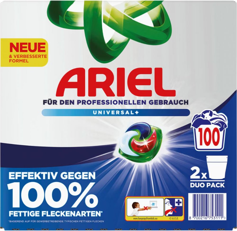 Německé Ariel gelové kapsle 100 ks Universal Professional disponují speciálním obalem, který se při kontaktu s vodou zcela rozpustí. Vysoce účinné látky vaše prádlo zanechají čistoskvoucí a voňavé jak z profesionální prádelny. Extra účinné proti odolným skvrnám. Vhodné na bílé a stálobarevné prádlo. Snadné dávkování. Extra svěží dlouhotrvající vůně. Praní při teplotách od 20°C do 95°C.