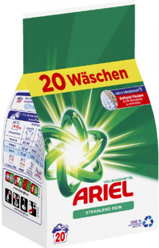 Ariel je koncentrovaný prášek určený pro praní bílých a světlých tkanin. Účinně odstraňuje obtížné a odolné nečistoty již při 20 °C a zároveň se stará o lesk vašeho oblečení. Obsahuje změkčovadlo vody, čímž chrání vaši pračku před usazováním vodního kamene. Zanechává svěží a dlouhotrvající vůni.