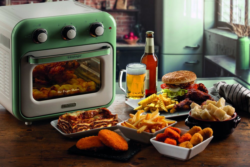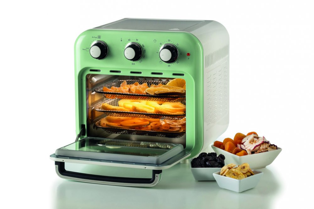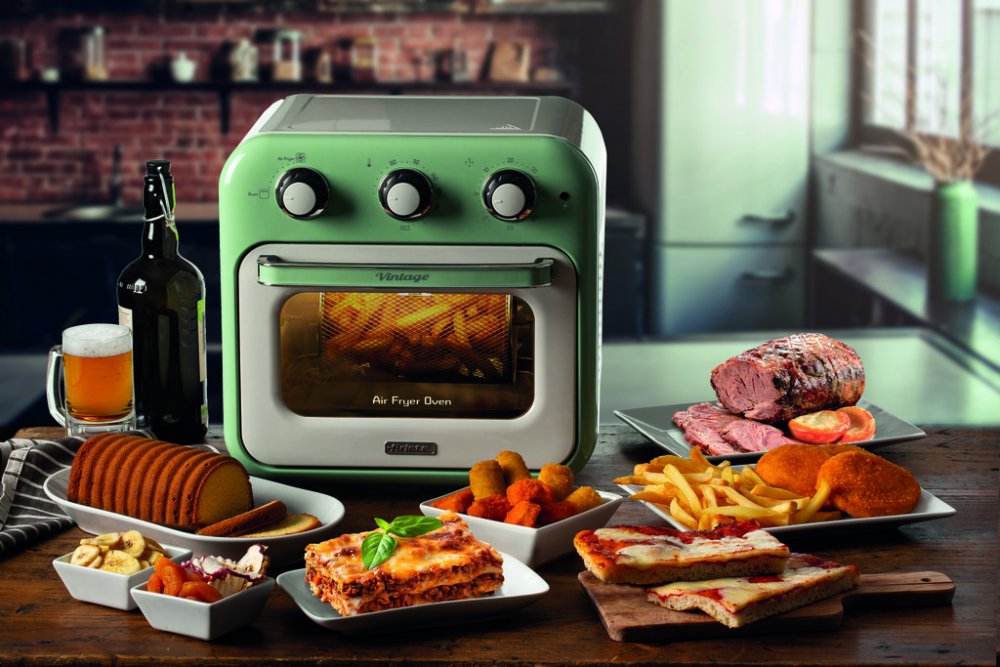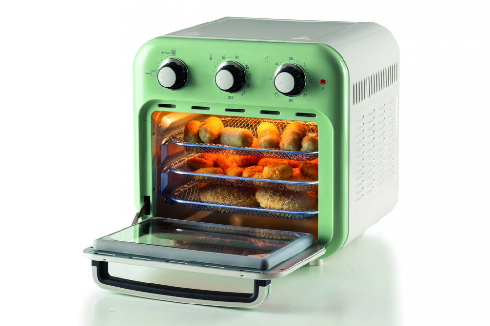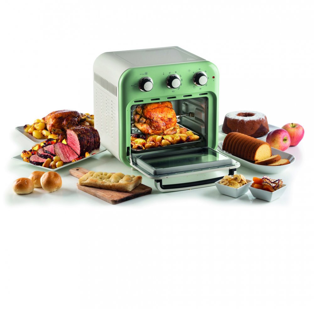 Ariete 4632/04 Air Fryer Oven v zeleném provedení je kombinací multifunkční trouby a vzduchové fritézy, která vám umožní připravit chutné a zdravé pokrmy s minimem oleje. Díky technologii horkovzdušného smažení a objemu 16 litrů můžete najednou připravit velké množství jídla – od hranolků, přes krokety až po maso či ryby. Vzduch cirkuluje rychlostí 360°, což zajišťuje rovnoměrné propečení a křupavost pokrmů při teplotě až 230°C. Stačí použít pouze jednu lžíci oleje, a vy si užijete lehčí a méně kalorická jídla, aniž byste se museli vzdát typické smažené chuti. Vintage design fritézy nejen zaujme na první pohled, ale je i plně funkční. Sada příslušenství obsahuje tři nerezové děrované koše pro oddělení potravin během vaření, otočný koš pro rovnoměrné pečení a gril na kuře. Ovládání je jednoduché pomocí otočných knoflíků, kterými lze nastavit teplotu, čas a různé programy vaření. Trouba se navíc snadno čistí a neprodukuje žádné zbylé oleje, čímž šetří životní prostředí. Díky použití vzduchu místo tuku se vyhnete nepříjemným pachům, které jsou běžné u tradičních fritéz, a po použití se trouba rychle a jednoduše otře. Speciální dvojité sklo udržuje vnější povrch chladný na dotek, což zaručuje bezpečné používání i v přítomnosti dětí. Objednávejte pod kat. číslem ART 4632/04
