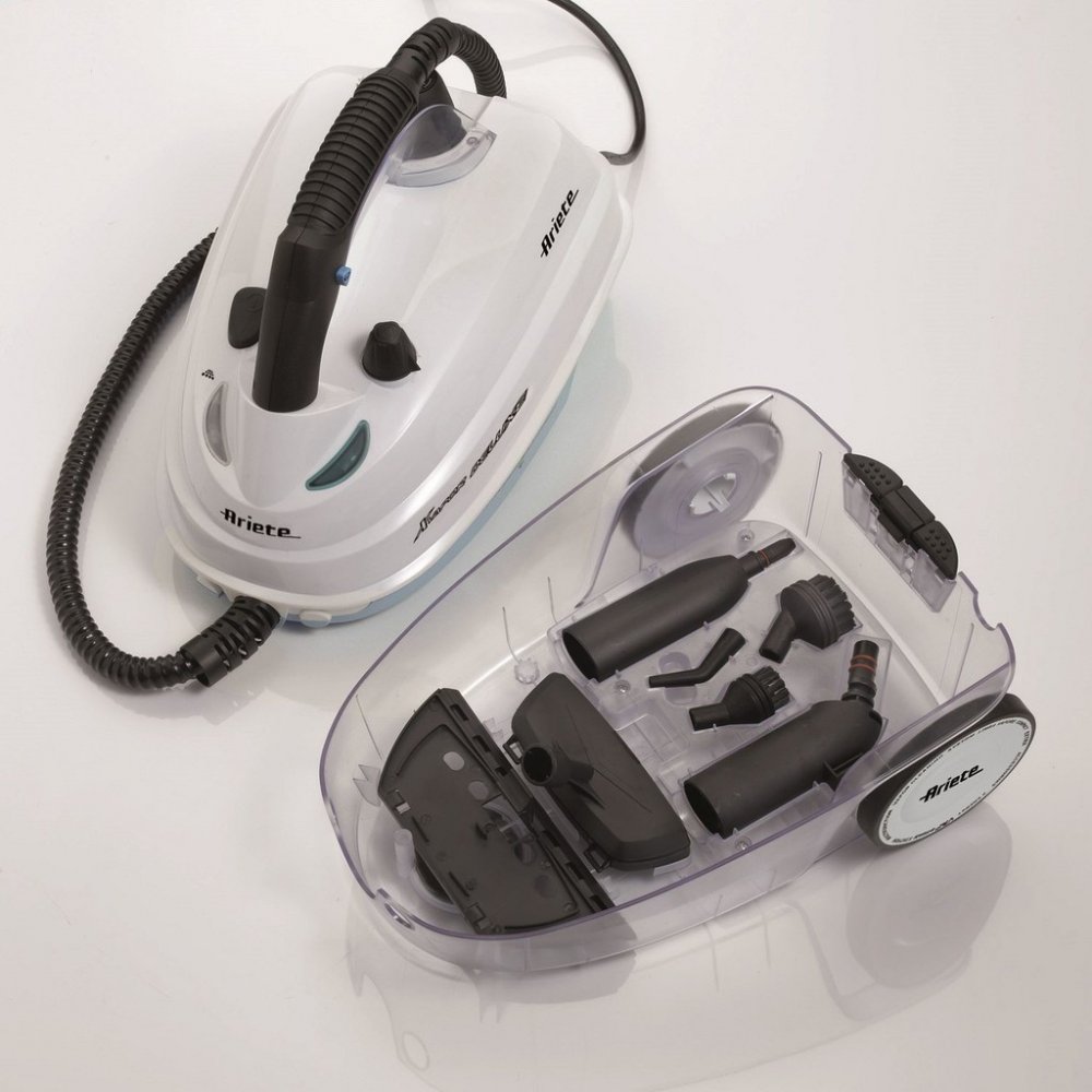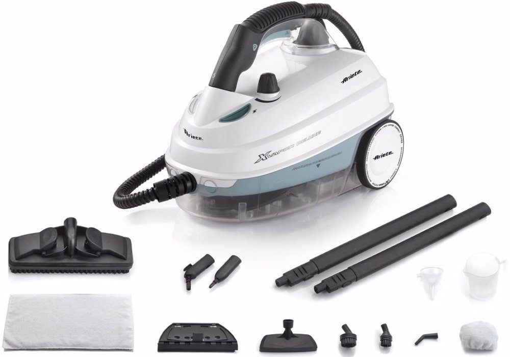 Ariete 4146 Xvapor Deluxe víceúčelový parní čistič Víceúčelový parní čistič Ariete 4146 Xvapor Deluxe představuje výkonný a komfortní víceúčelový parní čistič, který sjednocuje sílu, bezpečnost a praktičnost do jednoho kompaktního zařízení. S příkonem 1500 W a tlakem páry 5 barů tento parní čistič nabízí vynikající výkon pro důkladné čištění bez použití chemie. Bojler z nerezové oceli s kapacitou 1600 ml umožňuje až 60 minut nepřetržitého provozu, zatímco rychlá doba zahřátí 6–7 minut vám umožní rychle se pustit do úklidu. Bezpečnostní tlakový ventil a dětská pojistka zajišťují bezpečné používání, a to i při intenzivním tlaku páry. Jedním z hlavních přínosů parního čištění pomocí Xvapor Deluxe je jeho schopnost odstranit až 99 % virů, bakterií a choroboplodných zárodků pouze pomocí horké páry, což umožňuje úklid bez použití chemických čisticích prostředků. S bohatým příslušenstvím, uloženým prakticky v těle přístroje, tento multifunkční parní čistič dokáže účinně čistit různé povrchy od podlah až po okna. Regulace páry a nastavitelný výstup páry umožňují přizpůsobit čištění různým povrchům a citlivosti. Díky délce kabelu 6 m máte dostatečnou pohyblivost při úklidu, a uskladnění příslušenství v těle přístroje přináší praktičnost a snadný přístup k potřebným nástavcům. Xvapor Deluxe se adaptuje na všechny povrchy, od tvrdých krytin až po koberce, a umožňuje hloubkové čištění a dezinfekci bez použití chemických čisticích prostředků. Je ideální volbou pro domácnosti s malými dětmi, mazlíčky nebo alergiky, nabízí ekologický úklid a zanechává povrchy bezpečné pro celou rodinu. S XVapor Deluxe můžete efektivně čistit a dezinfikovat každý kout vašeho domova, od podlah až po záclony, a to bez nutnosti použití agresivních chemikálií. Bezpečnostní prvky, úložný prostor pro příslušenství a ekologický přístup k úklidu činí z Ariete 4146 Xvapor Deluxe skvělým společníkem pro každodenní domácí údržbu. Pára tohoto parního čističe je nejen účinná při odstraňování nečistot, ale také šetrná k životnímu prostředí, čímž nabízí čistotu a hygienu bez kompromisů. Objednávejte pod kat. číslem ART 4146