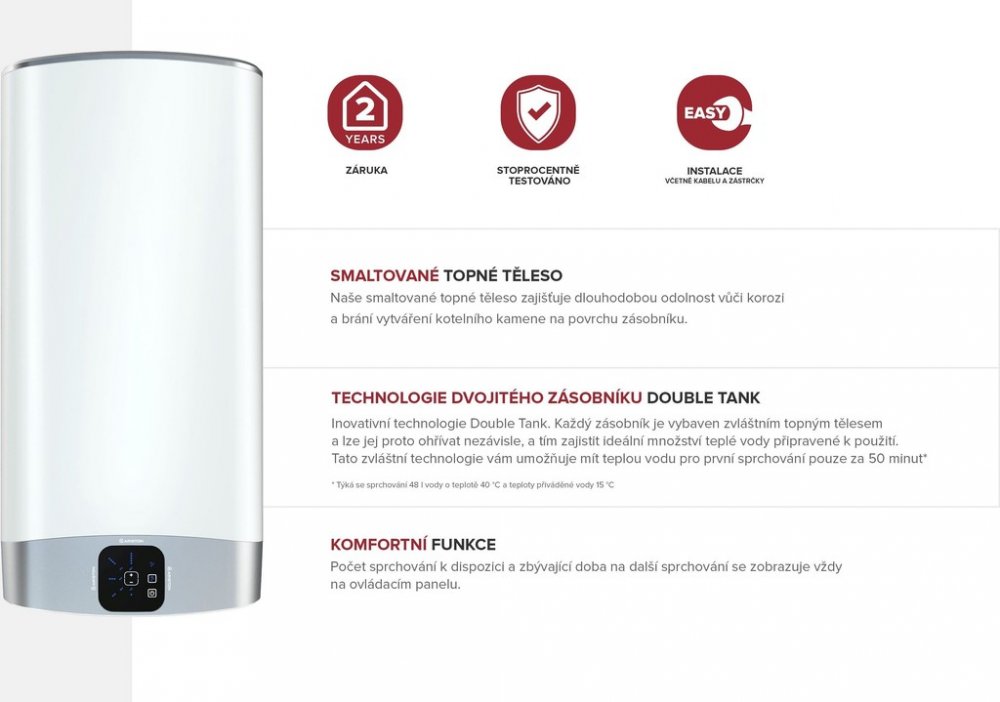 Chytře řešená konstrukce se dvěma nádržemi za účelem rychlejšího ohřevu vody. Množství vody potřebné na sprchu za 50min.