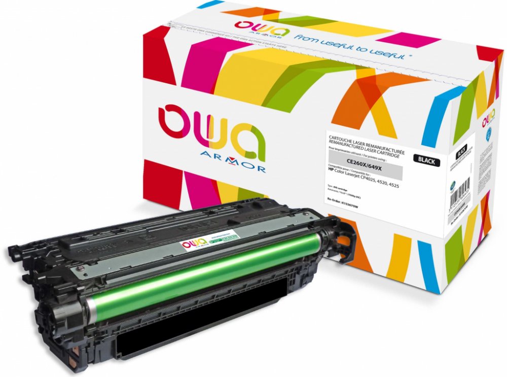 Alternativní černá tonerová kazeta OWA ARMOR s označením K15367OW je kompatibilní s originální kazetou HP CE260X a je určena pro laserová zařízení HP Color LaserJet CP 4520. Tato alternativa umožňuje vytištění až 17 000 stran při standardním 5% pokrytí. V případě, že máte nejasnosti ohledně kompatibility, obraťte se prosím na bezplatnou infolinku 800 157 928. Další informace na www.armor.cz Tonery OWA ARMOR – řešení pro zodpovědné Tonery OWA ARMOR – Unikátní kombinace ekonomického a ekologického řešení • Velmi kvalitní řada tonerových kazet OWA ARMOR do téměř všech tiskáren na trhu. • Na všechny tonery OWA ARMOR je poskytován bezkonkurenční servis v podobě doživotní záruky na kazety, převzetí záruky za nové tiskárny a zpětný odběr kazet. • ARMOR ručí za kvalitu tisku. • Žádný z tonerů OWA ARMOR neporušuje patentové právo. • Tonery OWA ARMOR vám umožňují splnit požadavky společenské odpovědnosti firem (CSR) v oblasti ochrany životního prostředí. • Při zapojení se do programu OWA získáváte automaticky tzv. Materiálový report, který můžete zahrnout do vašeho CSR reportu. Podívejte se, jak program OWA funguje https://www.youtube.com/watch?v=oLTvCXQd2jU S tonery OWA Armor zároveň získáváte: • ZDARMA zapojení do programu odběru vypsaných tonerů včetně získání tzv. materiálového reportu – šetříte životní prostředí. • ZDARMA technickou podporu na zákaznické lince 800 157 928. • ZDARMA 100% servis v podobě sítě specializovaných firem s operativním výjezdem technika na místo do 48 hodin. • ZDARMA širokou marketingovou podporu pro partnery • Jistotu, že žádné tonery OWA ARMOR neporušují patenty a jsou zdravotně nezávadné. • Francouzskou kvalitu prověřenou mezinárodními certifikáty. • Doživotní záruku na tonery OWA ARMOR. • Záruku na nové tiskárny.