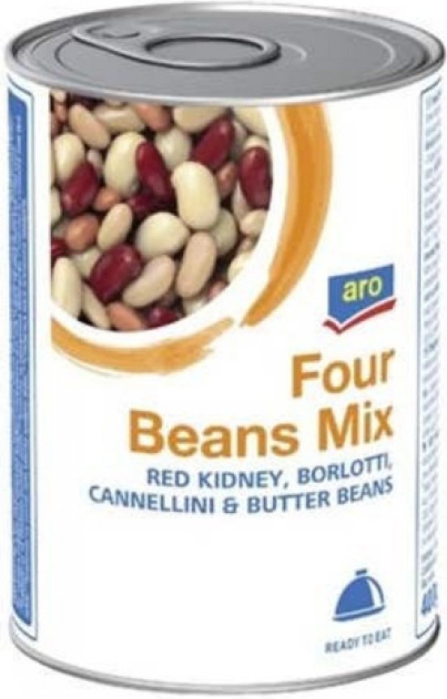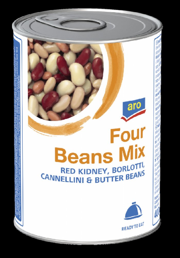 Směs čtyř fazolí ve slaném nálevu. Sterilovaný výrobek.