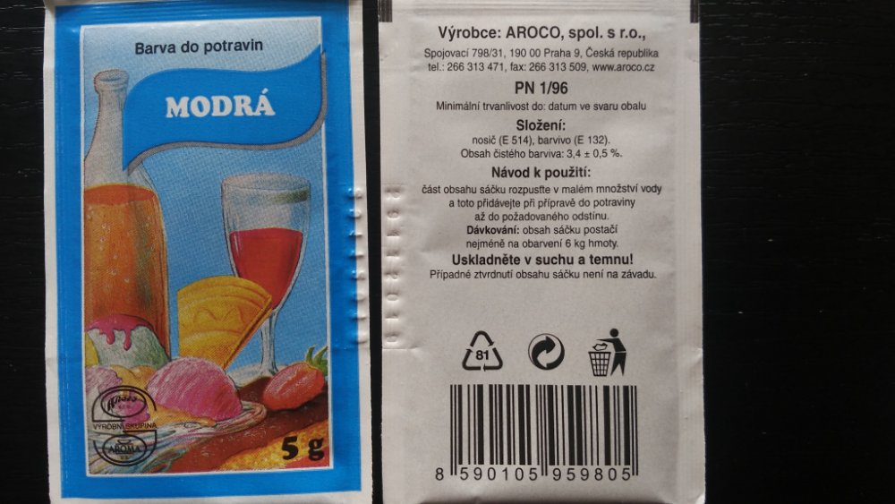 Aroco potravinářská barva do potravin je vhodná na obarvení Vašich potravin. Je zdravotně nezávadná a vhodná ke konzumaci. Udělejte Vaše jídlo pestřejší a zábavnější. Vaše potraviny obarví na modro.