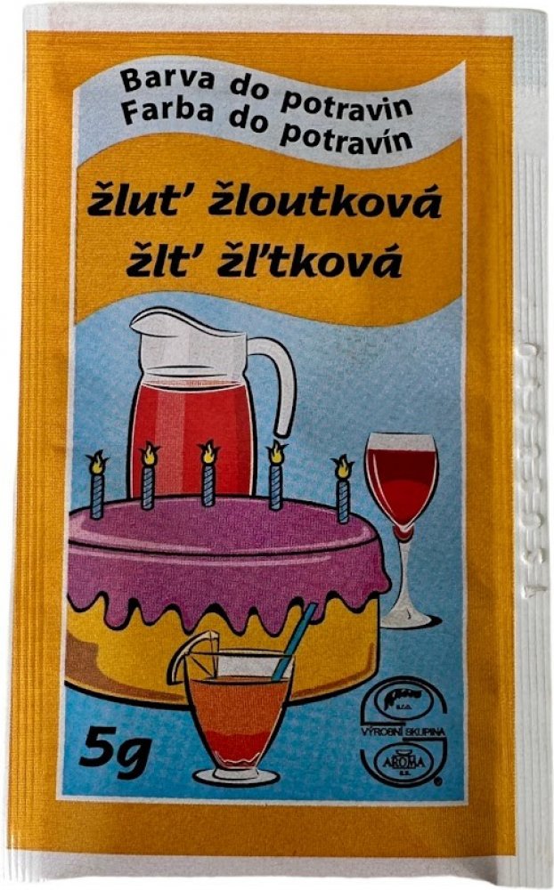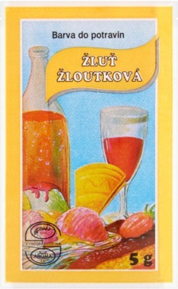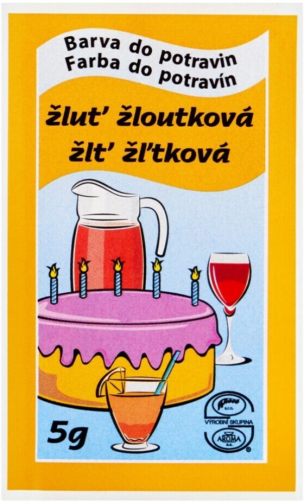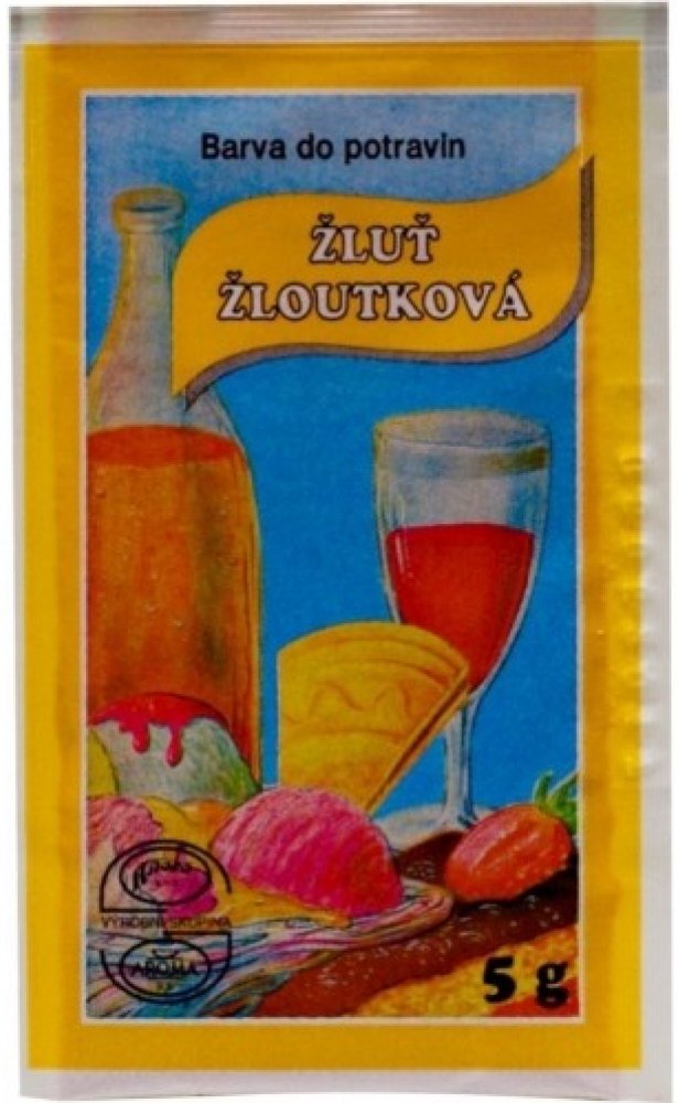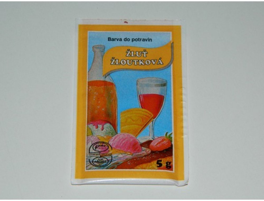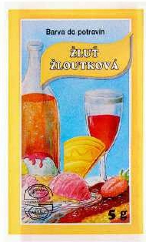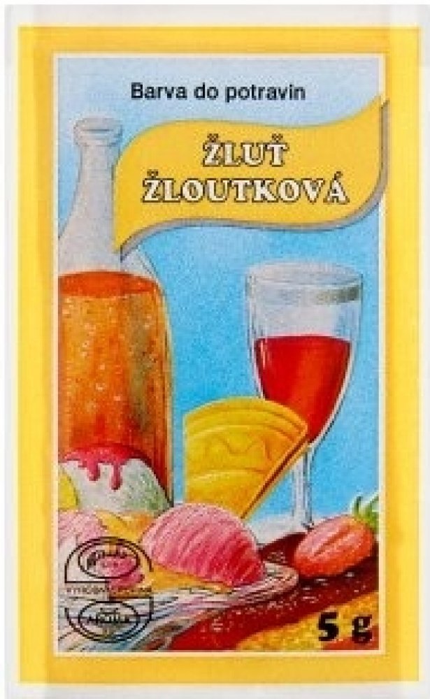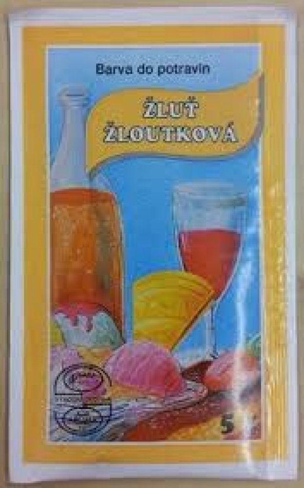 Český výrobek. Potravinářská barva v prášku v odstínu žloutkové žluti se používá k barvení všech potravin a nápojů.