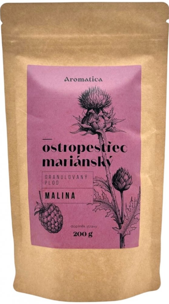 Ano, ostropestřec mariánský Malina obsahuje kromě granulovaného plodu ostropestřce také 10% koncentrované malinové šťávy v prášku a přírodní aroma, které zjemňují chuť. Neobsahuje přidaný cukr ani umělá barviva.