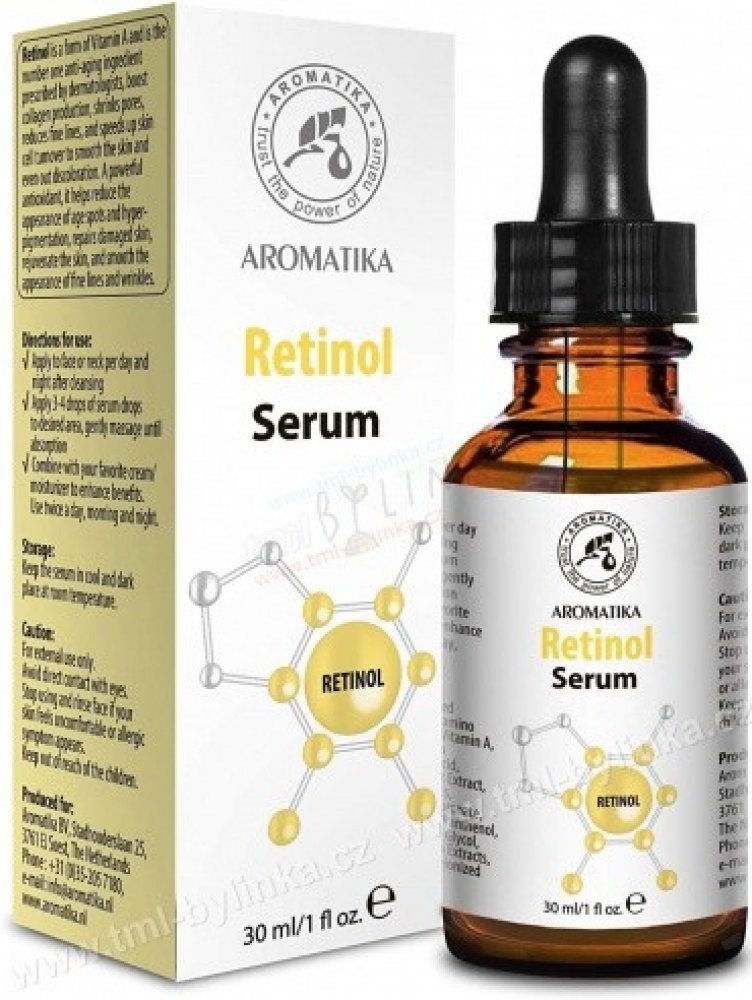 Retinol je forma vitamínu A, která je jedničkou mezi látkami proti stárnutí doporučovaná dermatology. Podporuje tvorbu kolagenu, stahuje póry, redukuje drobné linky, urychluje přeměnu kožních buněk, aby byla pleť vyhlazená a měla vyrovnanou barvu. Je to silný antioxidant, který pomáhá minimalizovat stařecké skvrny a hyperpigmentaci, omlazuje pleť a vyhlazuje drobné linky a vrásky.Způsob použití: Aplikujte na obličej a krk ráno a večer na vyčištěnou pleť. Naneste 3-4 kapky na požadovanou oblast a jemně masírujte až do úplného vstřebání. Aby jste zvýšili účinek, můžete použít sérum spolu se svým oblíbeným krémem. Aplikujte 2x denně (ráno a večer).Ingredients: Butylene Glycol, Hydrolyzed Betaglucan, Corn Gluten Amino Acids, Polyglutamic Acid, Vitamin A, Tremella Fuciformis Extract, Folic Acid, Bacillus/Soybean Ferment Extract, Portulaca Oleracea Extracts, Ceramide 3, Sodium Hyaluronate, Vitamin E, Xanthan Gum, Panthenol, Hydrolyzed Silk, Hexylene Glycol, Zanthoxylum Bungeanum Extracts, Citrus Grandis Extracts, Deionized Water.Skladování: Skladujte na chladném, tmavém místě při pokojové teplotě. Skladujte mimo dosah dětí.Upozornění: Pouze na vnější použití. Vyhněte se kontaktu s očima. Přestaňte s aplikací a opláchněte obličej, pokud cítíte nepohodlí nebo se objeví alergická reakce.Země původu: UkrajinaVýhradní distributor pro ČR: TML a.s., Zábrdovická 25/2, 615 00 BrnoObjem: 30 mlZ DŮVODU NAŘÍZENÍ EVROPSKÉHO PARLAMENTU A RADY (ES) č. 1223/2009 O KOSMETICKÝCH PŘÍPRAVCÍCH NEMŮŽEME O TOMTO VÝROBKU VÍCE INFORMACÍ.