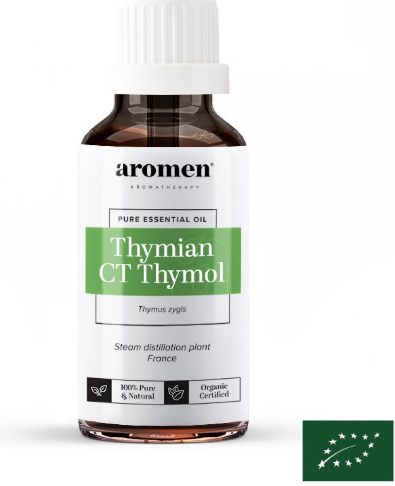 Thymian CT thymol poskytuje v difuzéru silnou vůni. Obvykle se trochu zjemňuje citronovým esenciálním olejem. Tymián je známý tím, že čistí vzduch a podporuje dýchací cesty. Olej má povznášející účinek při pocitu únavy. Ekologicky certifikováno belgickou společností Certisys.