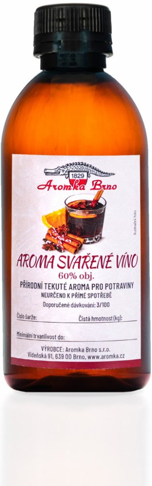 Svařené víno aroma je přírodní tekuté aroma na lihové bázi, vyrobené macerací koření (hřebíček, citron, skořice) ve směsi lihu a vody. Objem alkoholu aroma je 60% obj.