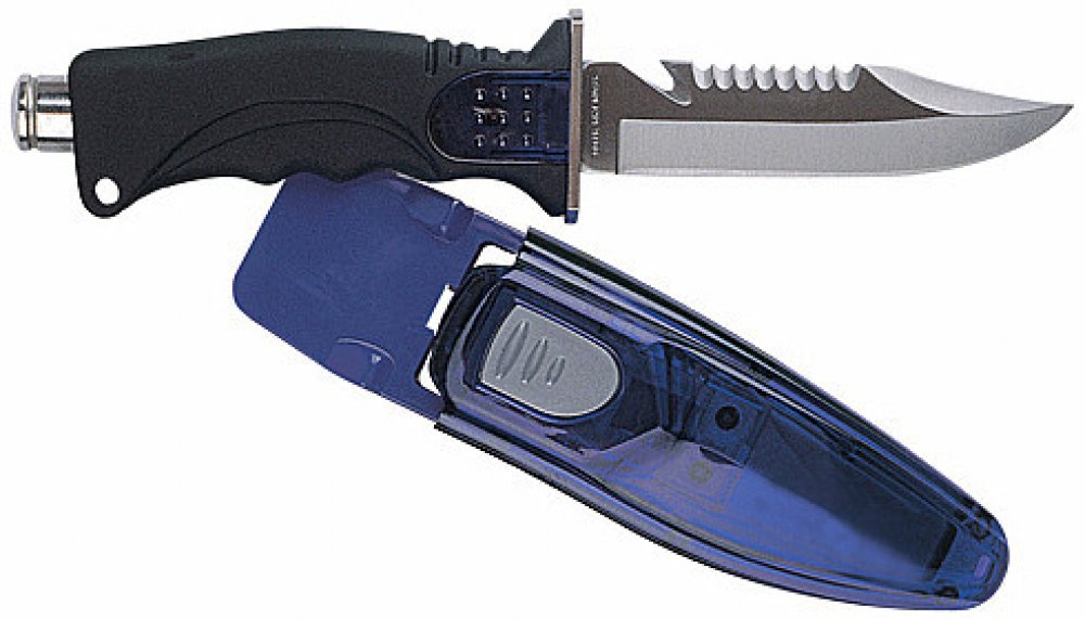 Potápěčský nůž Largo je vyroben z kvalitní japonské nerez oceli 420, s plastovým držadlem a pouzdrem. Včetně signalizačního kladívka.