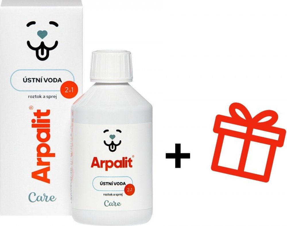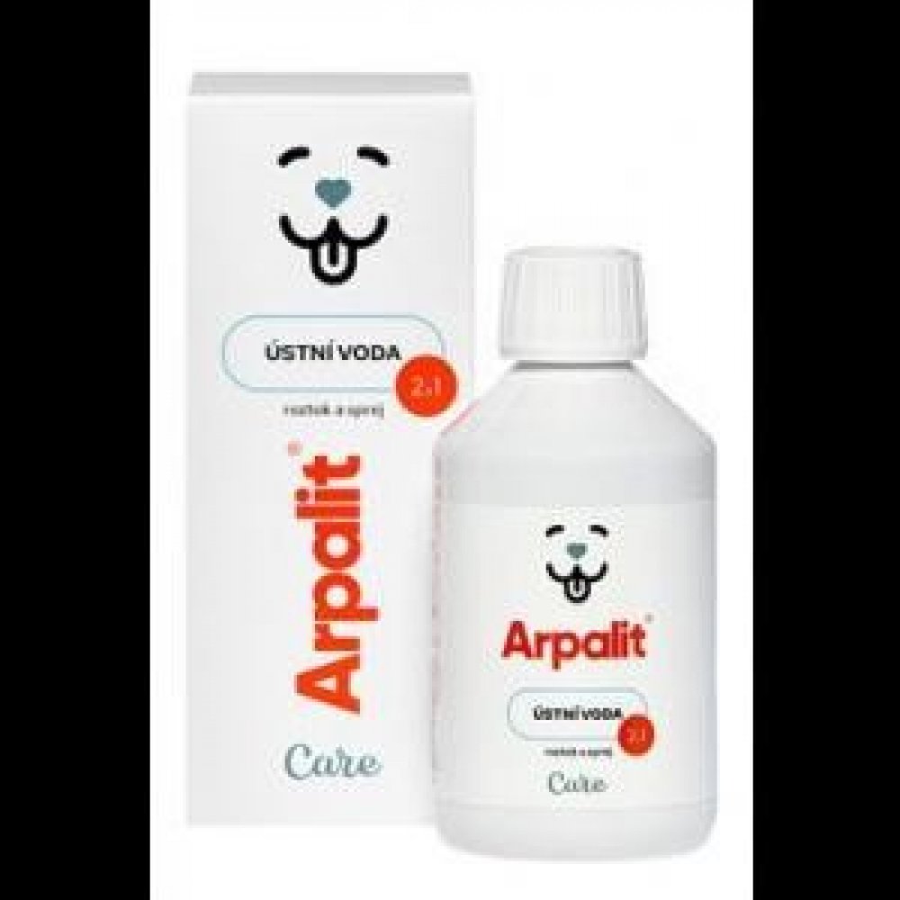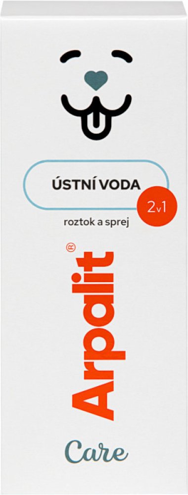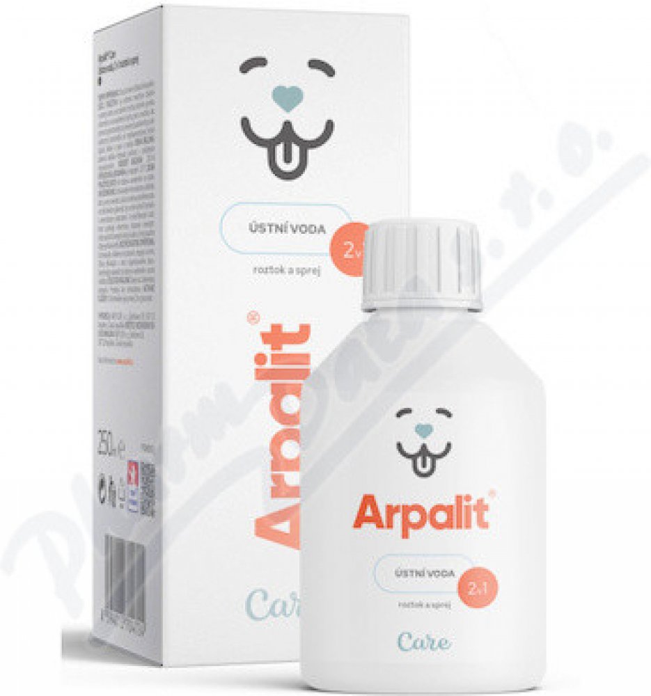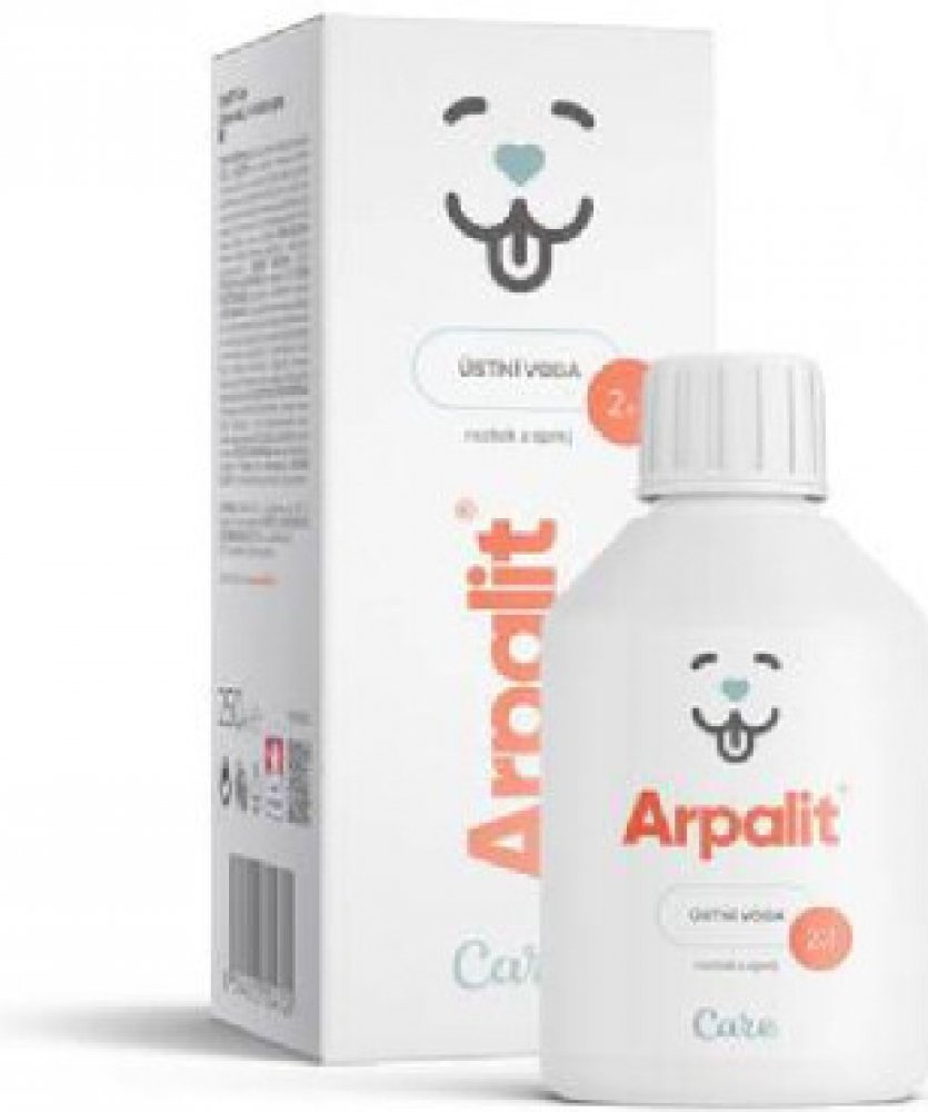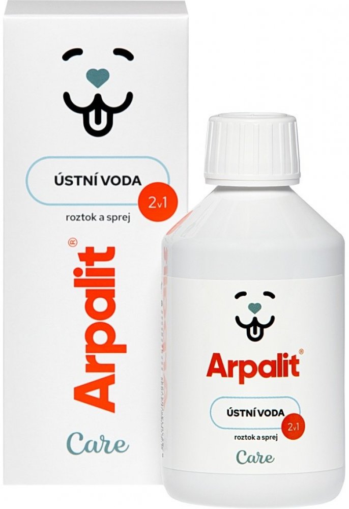 ARPALIT Care Ústní voda 2v1 roztok a sprej je veterinární přípravek ve formě ústní vody resp. spreje, který napomáhá ke snížení tvorby zubního plaku a zubního kamene. Přispívá k potlačení zápachu z tlamy. Je určen k přímé aplikaci do dutiny ústní psa a kočky nebo jako přídavek do vody na pití. Funguje rovněž jako pomocný přípravek v prevenci periodontálních onemocnění a podpůrný přípravek při medikované léčbě zánětu dásní psů a koček.