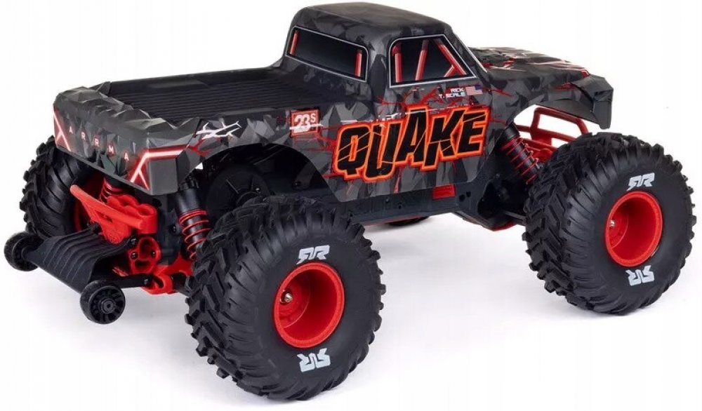 Arrma Quake má klasickou konstrukci oblíbených modelů typu monster truck s vysokou světlou výškou a velkými koly, což mu umožňuje uhánět téměř v jakémkoli prostředí – v terénu, na trávě, na parkovištích i asfaltovém povrchu. Nepřekonatelný bude zejména při jízdě v náročném terénu a při přejíždění i velkých nerovností. Kompozitní šasi odolá i tvrdým nárazům. Použité kovové převody jsou dostatečně odolné pro střídavý pohon. Maximální trakci zajišťují osvědčené pneumatiky dBoots Cut Chevron MT s typickým šípovým vzorem dezénu. Vysílač Spektrum SLT poskytuje bezpečný provoz bez výpadků, pro bezstarostnou jízdu jsou na modelu použity voděodolné* komponenty - regulátor s přijímače Spektrum 2-v-1 45A a servo řízení Spektrum S681 s vysokým točivým momentem.