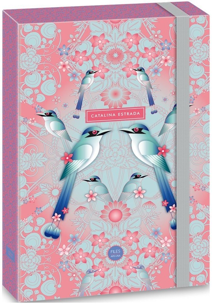 Box na sešity A4 Birds od výrobce Ars Una pro uložení dokumentů, výkresů a sešitů. Má krásný celoplošný tisk a design vhodný pro holky.Je vyroben z vysoce odolného, tvrdého lamino kartonu tloušťky 7 mm, který chrání umístěné listiny před poškozením. Uzavírání boxu je pomocí širší pružné gumičky, která důkladně udrží složku sevřenou. Ideální jako část školní výbavy.Rozměr: 23,5 x 4,8 x 33 cm