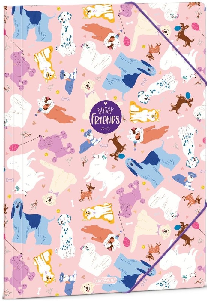 Složka na dokumenty z kolekce Doggy Friends od výrobce Ars Una určena pro formát sešitů a papírů velikosti A4, vhodná pro dívky.Uzavírání se provádí pomocí pružné gumičky na dvou okrajích.Desky jsou z pevného papírového materiálu - vložené listiny tím chrání před pokrčením a poškozením.Kvalitní celoplošný design.Rozměr: 33 x 24 cm