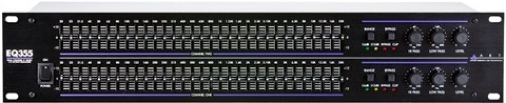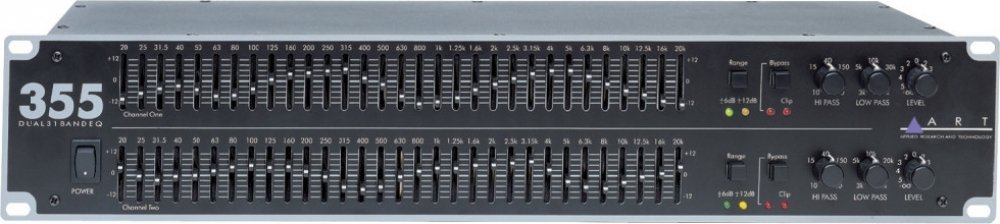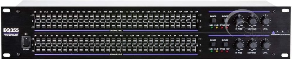 ART EQ 355 • duální 31-pásmový ekvalizér • přepínatelný rozsah pásem +/- 6 nebo +/- 12 dB • frekvenční rozsah 20 Hz - 20 kHz • navrženo pro roky nepřetržitého a spolehlivého výkonu • rackový formát 2U • HP/LP filtr • rozměry 89 x 483 x 216 (mm) • hmotnost 4,1 kg