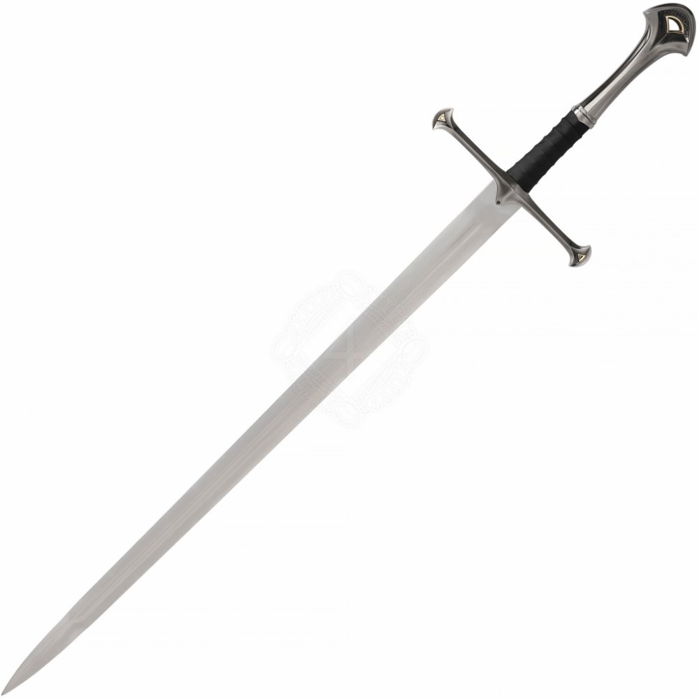 Meč Andúril Materiál čepele: kalená nerez ocel Na čepeli nejsou vyleptané žádné ozdobné runy Dodávka včetně ozdobné plakety na vystavení na zdi. Celková délka 1322 mm Délka čepele 1012 mm Délka záštity 268 mm Šíře čepele u záštity 49,50 mm Délka žlábku 795 mm Šíře čepele 10 cm od špičky 30,38 mm Síla úderné hrany cca 1,95 mm Délka hlavice 175 mm Délka rukojeti 115 mm Těžiště leží cca 140 mm od záštity Hmotnost cca 2204 g Uvedené údaje se můžkou kus od kusu mírně lišit.