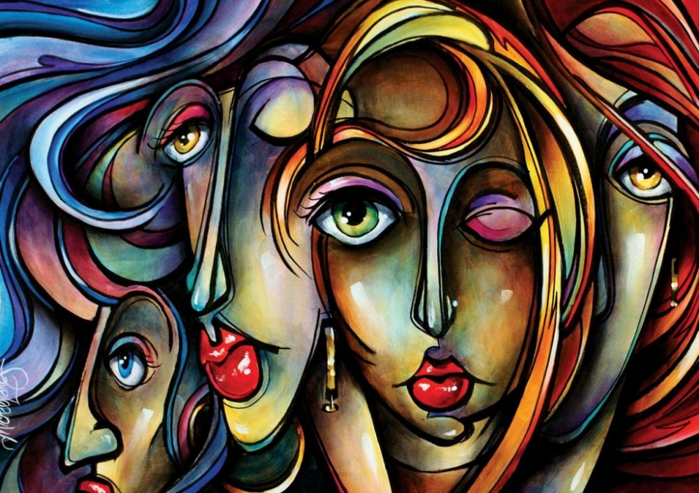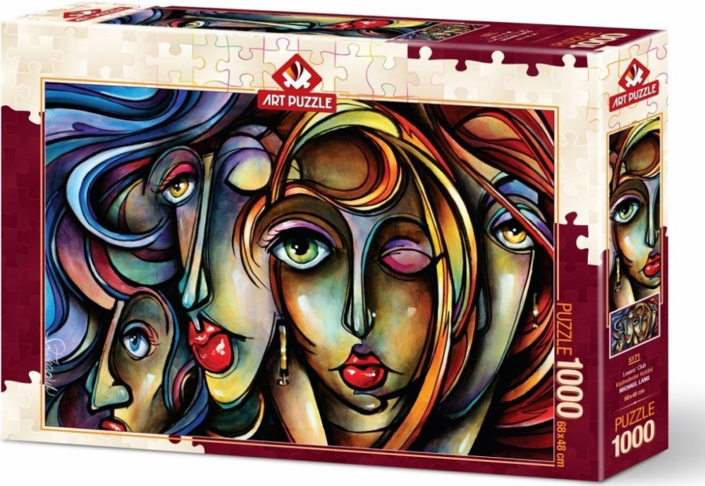 Puzzle od firmy Art Puzzle v obdélníkovém tvaru s krásným motivem obrazu Klub Ztroskotanců (Full tilt), autorem je americký malíř Michael Lang. Na obrázku jsou zachyceny barevné prolínajícící se ženské tváře.
