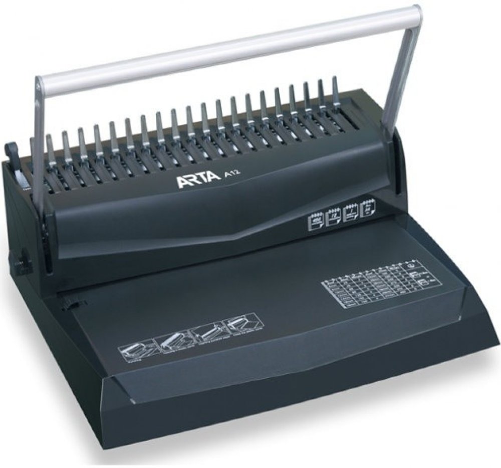 Je vybaven oddělenými pákami pro děrování a roztažení kroužku. Najednou prosekne až 12 listů (21 otvorů) a sváže 450 listů. Nastavitelný postranní doraz pro nastavení přesného vycentrování. Nastavitelná hloubka prosekávání 2-5 mm pro optimální výsek dle síly dokumentu. Snadno vysypatelná odpadní zásuvka.