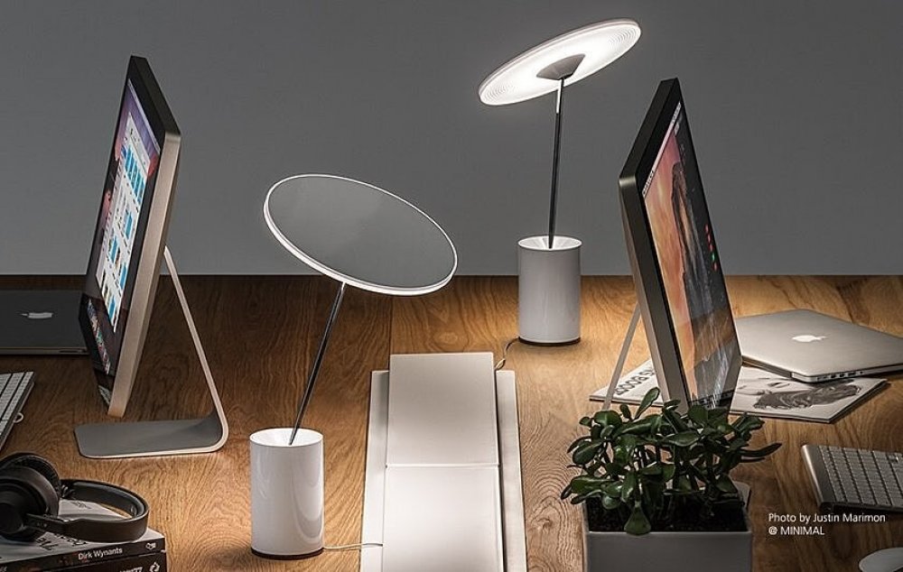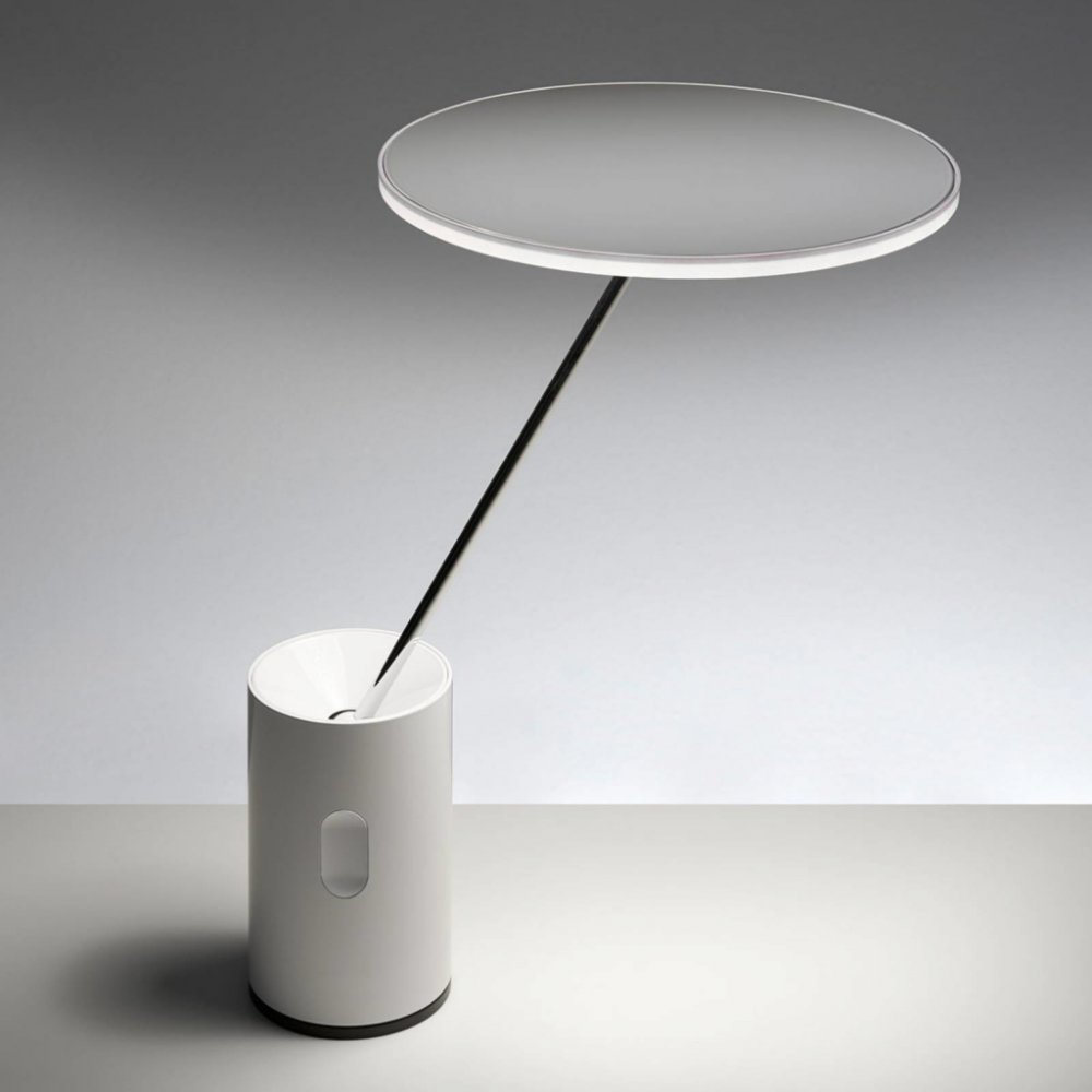 Malá stolní LED lampa Sisifo od společnosti Artemide s otočnou hlavou funguje stejně dobře jako pracovní i ambientní osvětlení. Integrovaný dotykový stmívač.
