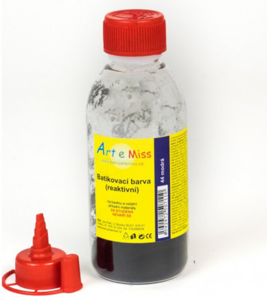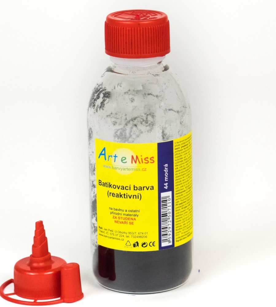Batikovací barva v aplikační lahvičce s hrotem. Lahvičku naplníme teplou vodou a protřepeme. Necháme min. hodinu rozpustit. Potom barvu aplikujeme na látku.