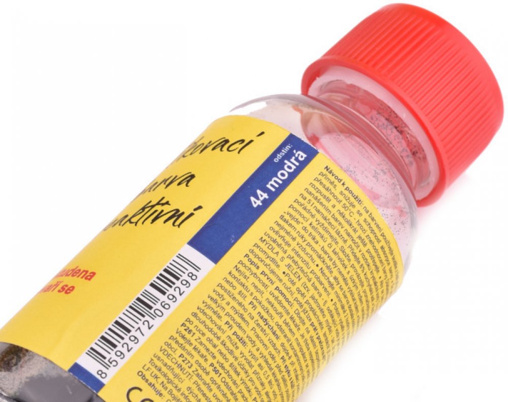 Reaktivní barva na batikování za studena. Obsah 5g barvy, který stačí jen dolít vodou a můžete barvit. na bavlnu a ostatní přírodní materiály za studena - nevaří se.