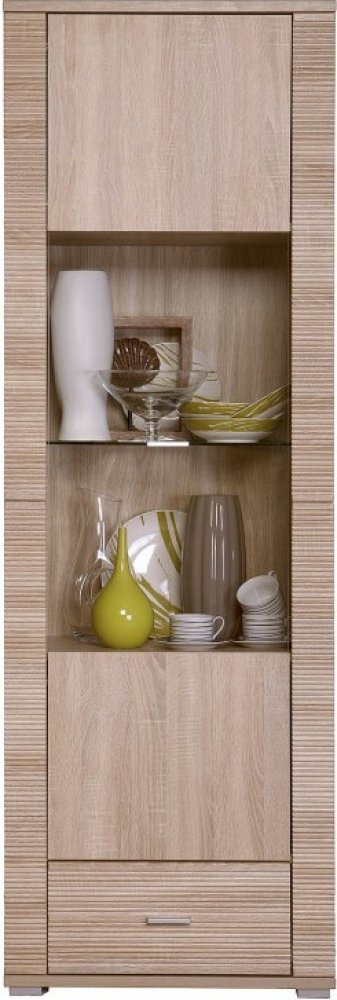 Vitrína GRESS 1W1S-L/P (Dub sonoma) může být elegantním doplňkem obývací stěny nebo jídelny. Nabízí dostatek úložného prostoru a lze ji doplnit o LED osvětlení. Vložená, skleněná police tl. 4 mm skvěle doplňuje částečně prosklená dvířka vitríny. Ve spodní části je praktická zásuvka na kuličkových pojezdech. Jde o jeden z dílů moderního nábytku ve velice oblíbeném dekoru dub sonoma. Kolekce nábytku...