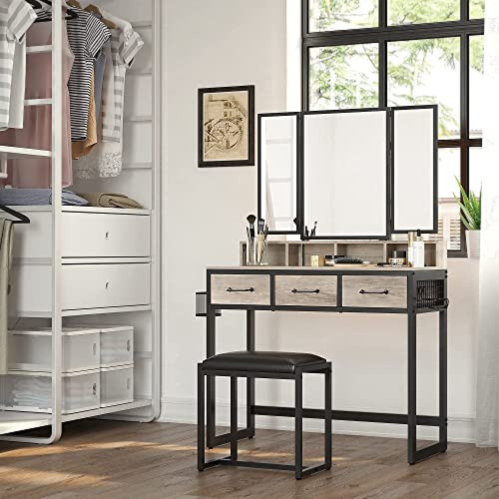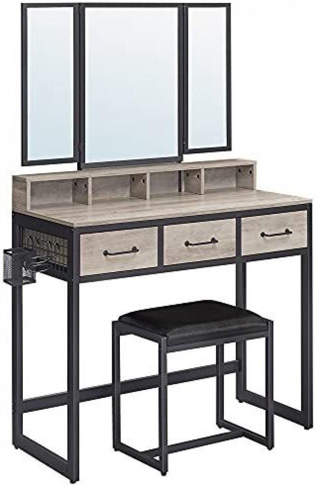 Velké zrcadlo toaletního stolku se skládá ze 3 částí. Dvě strany se sklápějí, takže si můžete zkontrolovat svůj make-up z různých úhlů a nechat si pomoci při stylingu.