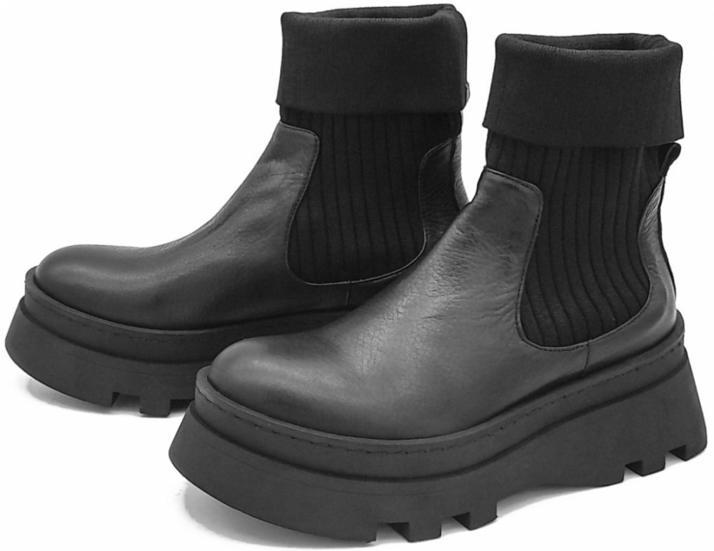Dámská kotníková obuv z hladké kůže v kombinaci s textilním úpletem. Obuv s robustní platformou s protiskluzovým vzorkem.