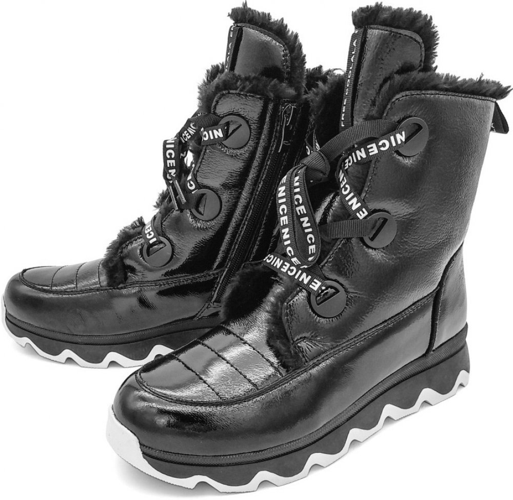 Dámské zateplené kotníkové boty na zip v černé barvě. Vnitřek je zateplený textilními vlákny. Boty je možné utáhnou tkaničkami. Vnější povrch tvoří lesklá hladká kůže.