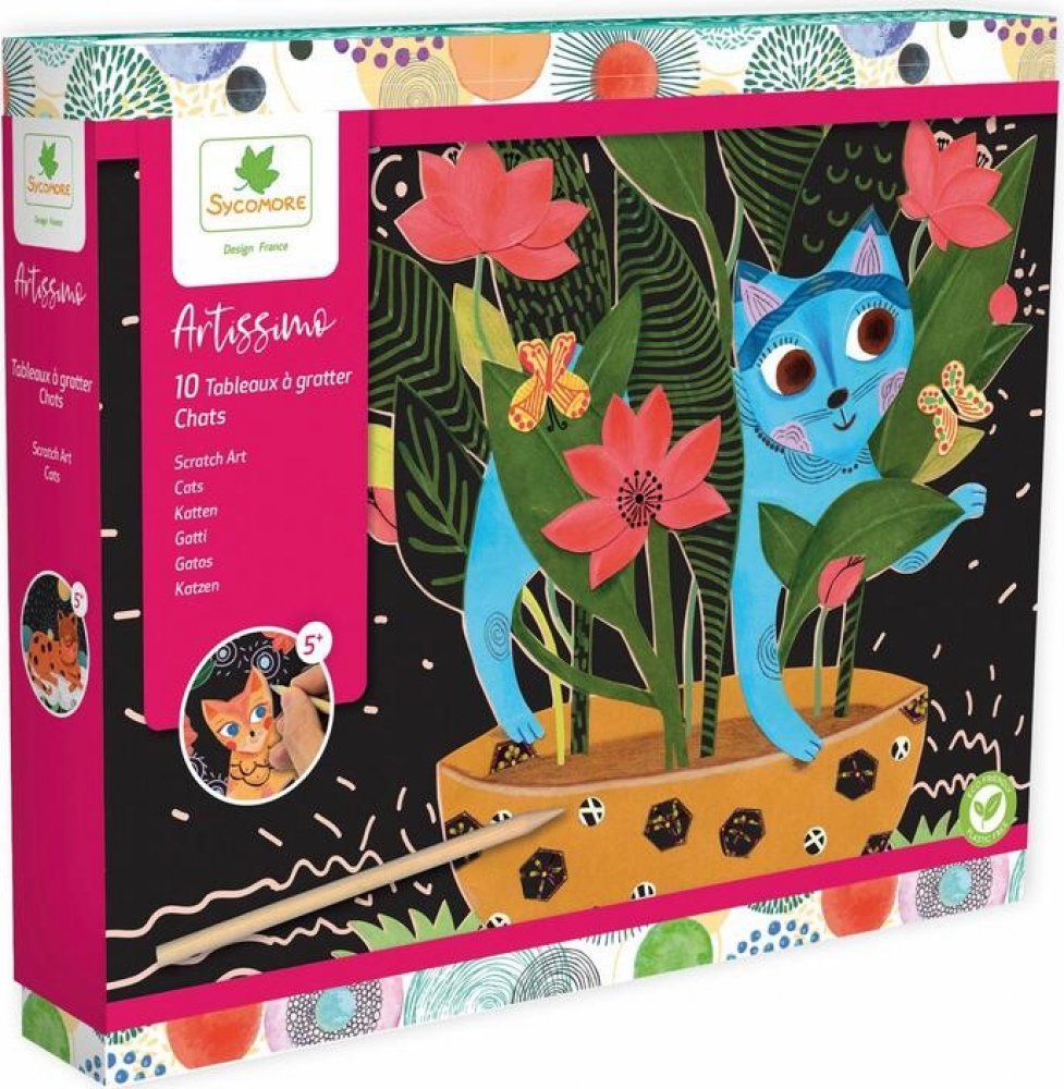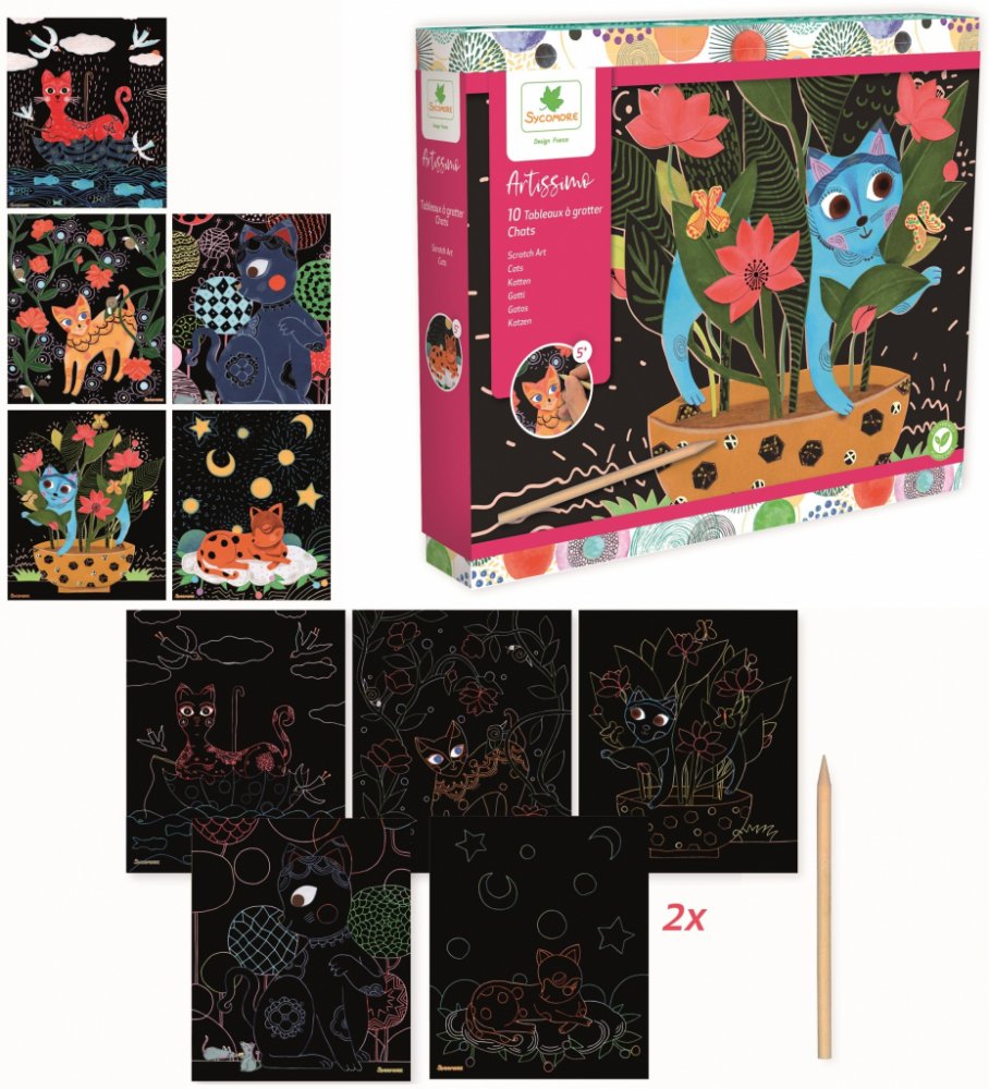 Sycomore Škrabací obrázky - Kočky Kočicka pod noční oblohou a další krásné motivy s kočičkou k vyškrabávání, v kontrastu s tmavým pozadím vypadá efektně a vyzdobí každý pokojíček nebo potěší jako dárek pro vaše nejbližší. Balení obsahuje: 10 kusů škrabacích obrázků, dřevěné škrabátko ve tvaru tužky s hrotem a barevný návod. Baleno v luxusní pevné krabičce se zavíráním na magnet, která poslouží jak...