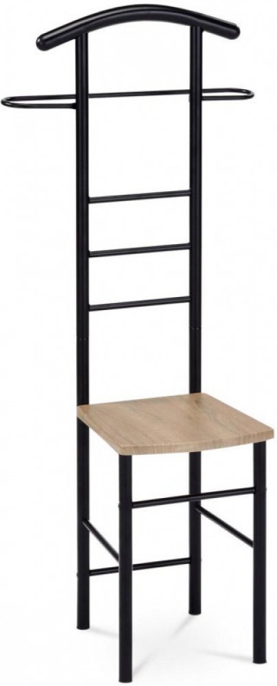 Designový, praktický a multifunkční němý sluha s integrovaným sedákem. Kostra je z kovových trubek lakované černou matnou práškovou barvou. Výška 119 cm Vám umožní zavěšení oblečení i doplňků zcela bez pomačkání. Nosnost stojanu je až 90 kg, což umožňuje stojan používat i jako plnohodnotnou židli pro nečekané návštěvy. Sedák je z MDF v 3DImitaceu dub sonoma. Nohy konstrukce jsou zakončeny plastovými kluzáky, eliminující poškození podlahy. Horní zaoblená trubka je zakončena dekorativními černými půlkulatými záslepkami. Tento sluha najde uplatnění všude, kde potřebujete odložit šatstvo. Ať v ložnicích, šatnách, studentských či dětských pokojích. Poházné oblečen už bude minulostí.