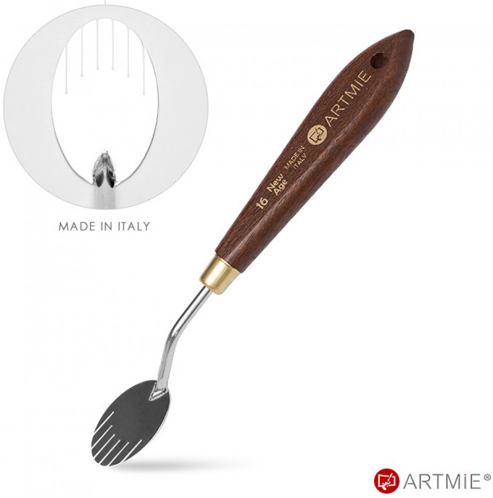 ARTMIE umělecké špachtle jsou novou kvalitní řadou paletových nožů nejrůznějších forem vyrobených v Itálii. Široká škála nových tvarů umožňuje různá použití, od tenkých flexibilních čepelí pro malé, dobře definované detaily, až po širší čepele se zaoblenými hranami a zvláštními tvary, kterými se jednoduše nanáší barva v různých vrstvách a strukturách. Paletový nůž má čepel vyrobenou z kalené nerezavějící oceli a je ručně broušená, aby byla zajištěna její optimální flexibilita. Lesklý hladký povrch poskytuje vynikající schopnost rovnoměrného rozptylování barvy. Ergonomická a funkční rukojeť je vyrobena z leštěného dřeva a má otvor na zavěšení. A nakonec je čepel připevněna k rukojeti pomocí kroužku z leštěné mosaze. Špachtle ARTMIE díky těmto vlastnostem vyniká svým precizním zpracováním a mnohostranným využitím. PARAMETRY PRODUKTU:ARTMIE umělecká špachtleVyrobena z vysoce kvalitních materiálůRučně broušená, kalená a nerezová ocelová čepelStylová ergonomická dřevěná rukojeť s logem ARTMIEDélka čepele 3,5 cmDélka rukojeti 11 cmMade in ItalyProhlédněte si nabídku dalších profesionálních špachtlí ARTMIE: