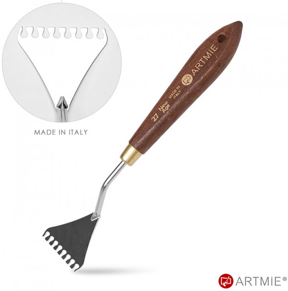 ARTMIE umělecké špachtle jsou novou kvalitní řadou paletových nožů nejrůznějších forem vyrobených v Itálii. Široká škála nových tvarů umožňuje různá použití, od tenkých flexibilních čepelí pro malé, dobře definované detaily, až po širší čepele se zaoblenými hranami a zvláštními tvary, kterými se jednoduše nanáší barva v různých vrstvách a strukturách. Paletový nůž má čepel vyrobenou z kalené nerezavějící oceli a je ručně broušená, aby byla zajištěna její optimální flexibilita. Lesklý hladký povrch poskytuje vynikající schopnost rovnoměrného rozptylování barvy. Ergonomická a funkční rukojeť je vyrobena z leštěného dřeva a má otvor na zavěšení. A nakonec je čepel připevněna k rukojeti pomocí kroužku z leštěné mosaze. Špachtle ARTMIE díky těmto vlastnostem vyniká svým precizním zpracováním a mnohostranným využitím. PARAMETRY PRODUKTU:ARTMIE umělecká špachtleVyrobena z vysoce kvalitních materiálůRučně broušená, kalená a nerezová ocelová čepelStylová ergonomická dřevěná rukojeť s logem ARTMIEDélka čepele 3,5 cmDélka rukojeti 11 cmMade in ItalyProhlédněte si nabídku dalších profesionálních špachtlí ARTMIE:
