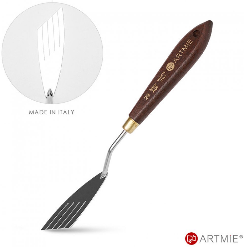 ARTMIE umělecké špachtle jsou novou kvalitní řadou paletových nožů nejrůznějších forem vyrobených v Itálii. Široká škála nových tvarů umožňuje různá použití, od tenkých flexibilních čepelí pro malé, dobře definované detaily, až po širší čepele se zaoblenými hranami a zvláštními tvary, kterými se jednoduše nanáší barva v různých vrstvách a strukturách. Paletový nůž má čepel vyrobenou z kalené nerezavějící oceli a je ručně broušená, aby byla zajištěna její optimální flexibilita. Lesklý hladký povrch poskytuje vynikající schopnost rovnoměrného rozptylování barvy. Ergonomická a funkční rukojeť je vyrobena z leštěného dřeva a má otvor na zavěšení. A nakonec je čepel připevněna k rukojeti pomocí kroužku z leštěné mosaze. Špachtle ARTMIE díky těmto vlastnostem vyniká svým precizním zpracováním a mnohostranným využitím. PARAMETRY PRODUKTU:ARTMIE umělecká špachtleVyrobena z vysoce kvalitních materiálůRučně broušená, kalená a nerezová ocelová čepelStylová ergonomická dřevěná rukojeť s logem ARTMIEDélka čepele 7,1 cmDélka rukojeti 11 cmMade in ItalyProhlédněte si nabídku dalších profesionálních špachtlí ARTMIE: