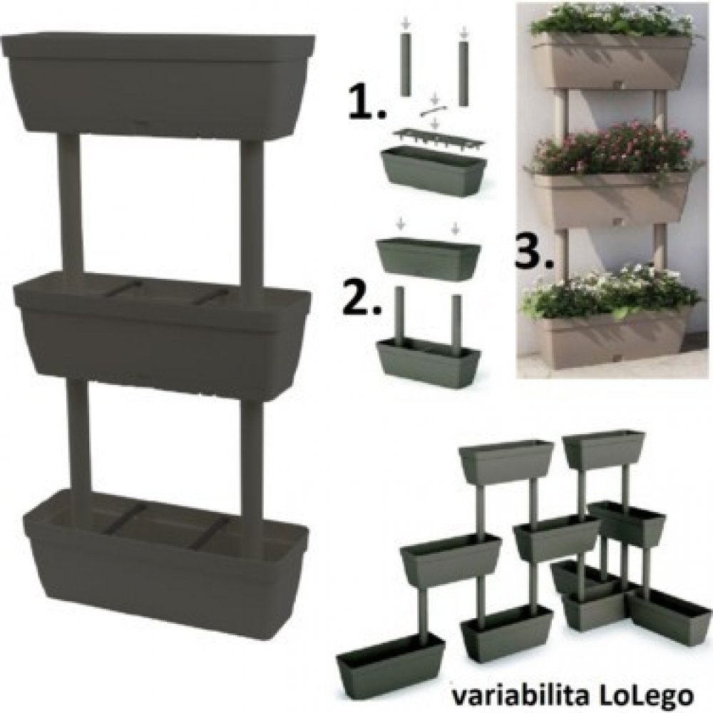 Třídílný květináč z termoplastové pryskyřice odolné vůči povětrnostním vlivům, vhodný k výsadbě květin nebo bylinek. Možnost spojování více květináčů pro vytvoření rostlinného systému nebo samostatné použití jednotlivých nádob. Zásobník na vodu s vyjímatelným dnem.