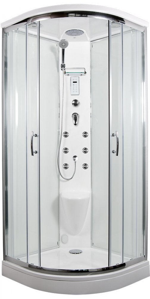 Klasický čtvrtkruhový sprchový box vlastní výroby s posuvnými dveřmi se vyznačuje jednoduchým designem, vysokou kvalitou zpracování. Profil je z leštěného hliníku, prosklení z 5 mm bezpečnostního grape skla, zadní sklo super bílé neprůhledné, šířka vstupu 53 cm. Vanička je z litého mramoru, vlastní výroby, v bílé barvě. Výroba panelu, předního panelu k vaničce a stropu je nyní z kompozitních materiálů, které se používají v leteckém průmyslu. Vůči dříve používané polyesterové pryskyřici je kompozitní materiál ekologičtější, lépe zpracovatelný a při stejné tloušťce výrobku pevnější. Je to také důvod, proč můžeme dosáhnout tak dokonalé povrchové úpravy.