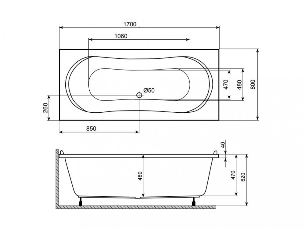 Rozměr: 170 x 80 x 48 cm (k tomu nutno připočíst 12 - 16 cm nastavitelný rám s nožičkami). Nožičky se nastaví dle potřeb při obezdívání, případně podle rozměru krycího panelu.
