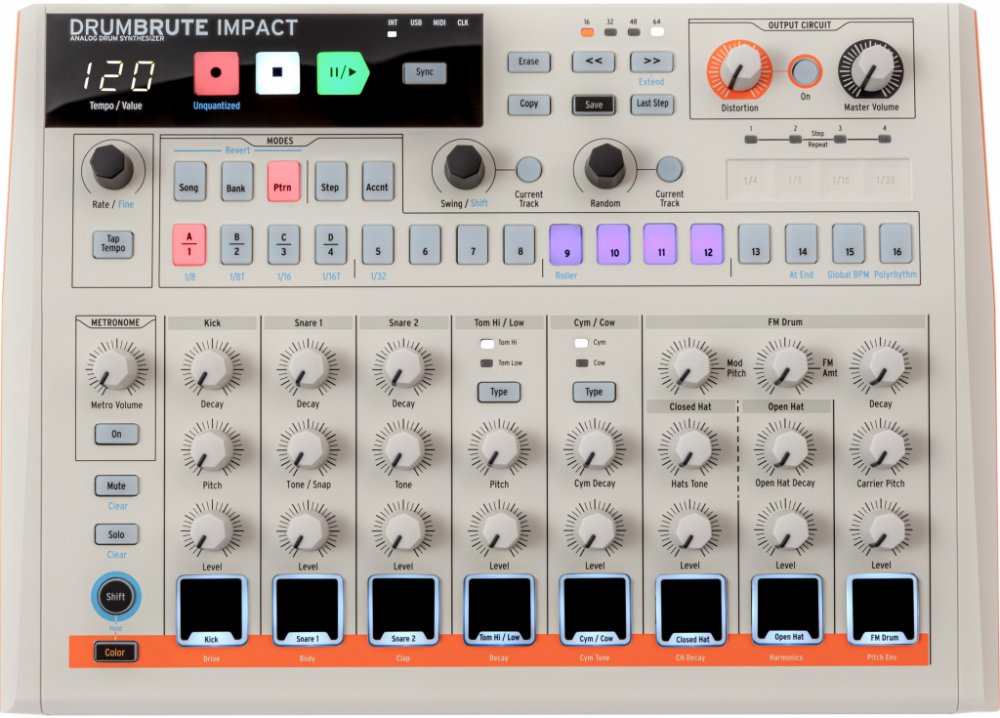 Analogový groovebox Arturia DrumBrute Impact navazuje na úspěšný DrumBrute a v novém kabátku je návykově zábavný, přičemž si zachovává veškerý potenciál a skvělý zvuk svého předchůdce. Limitovaná edice desetihlasého analogového drum machine Arturia DrumBrute Impact 1984 nabízí klasické analogové zvuky bicích nástrojů, moderní funkce a přepracovaný estetický vzhled inspirovaný vintage bílou barvou. Arturia DrumBrute Impact obsahuje 10 různých zvuků bicích nástrojů. Kick, dva snare, vysoký tom/nízký tom, činel/cowbell, uzavřená hi-hat, otevřená hi-hat a FM perkuse. Tomy sdílejí stejnou řadu v rámci sekvenceru a mezi vysokým a nízkým tomem můžete volit stiskem tlačítka - totéž platí pro zvuky činelu a cowbellu. Pokud jde o vytváření vlastních sekvencí, DrumBrute pojme 64 patternů, z nichž každý může mít až 64 kroků. Tvorba komplexních polyrytmů nikdy nebyla jednodušší. DrumBrute Impact umožňuje, aby každá jednotlivá bicí stopa měla libovolnou délku, což vám umožní vytvářet polyrytmy s libovolnou kombinací bicích zvuků.DrumBute Impact nabízí výkonnostní efekty, jako je Pattern Looper (pro opakování beatů) a Step Repeat (pro smyčkové glitch efekty), které z něj dělají skvělý nástroj pro improvizaci. K dispozici je také režim Roller pro vytváření různých bicích meziher a přechodů. Režim Song umožňuje řetězit patterny do delší kompozice, čímž dále rozšiřuje možnosti vystupování.Jakmile na svém bicí automatu vytvoříte úžasný bicí pattern a chcete jej dostat do DAW ke zpracování nebo mixování, poslední věc, kterou chcete dělat, je nahrávat jednotlivé zvuky do samostatných stop - to se rychle omrzí. Arturia DrumBute Impact nabízí 4 samostatné zvukové výstupy (plus výstup master mixu), díky kterým můžete groovy snadno nahrávat do počítače jako vícestopý zvuk. Swing a akcent jsou dva nejběžnější způsoby, jak přidat feel a dynamiku pro pattern bicího automatu. Akcent je podle očekávání k dispozici pro každou skladbu zvlášť. Funkci Swing lze aplikovat na pattern jako celek, a pokud se rozhodnete, můžete také aplikovat různé množství swingu na jednotlivé bicí stopy. DrumBute Impact má také možnost náhodnosti, která je ideální pro vytvoření lidštějšího dojmu - můžete ji aplikovat globálně nebo také na jednotlivé stopy. Můžete také použít exkluzivní zvukové barvy „Color“, abyste do hry vnesli jedinečný efekt pro každý nástroj a získali tak určitou variabilitu. Stisknutím tlačítka zvýšíte harmonický obsah, přidáte drive, snap nebo crack a dokonce můžete automatizovat změny tónů vytvořením sekvence „Color“. Pokud chcete, aby vaše bicí ještě více přitlačily na pilu, použijte vestavěné zkreslení na výstupu pro trochu crunche optimalizovaného pro bicí.
