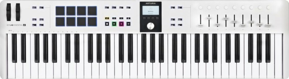 USB/MIDI keyboard Arturia Keylab Essential 49 a 61 je naprosto ideálním společníkem každého digitálního producenta. Kromě klaviatury je k dispozici řada ovládacích prvků pro plynulou práci, nabitý softwarový balíček a možnost použití bez počítače díky zdroji a MIDI konektivitě. I kdybyste byli naprostí začátečníci, díky dodávanému softwaru můžete s hudební produkcí začít ve velkém stylu. Analog Lab nabízí tisíce zvuků a 17 vintage nástrojů včetně simulací analogových syntezátorů, varhan, smyčců ad. UVI Grand Piano Model D je pečlivě vysamplovaný zvuk koncertního křídla Steinway D, které najdete v koncertních sálech po celém světě. Vašenápady ihned zaznamenáte pomocí DAW software a výkonného sekvencéru Ableton Live Lite, bez kterého se v současnosti neobejde snad žádný producent. K ovládání slouží dynamicky citlivá klaviatura včetně modulačního a pitch kolečka, performance ovladače pro kontrolu vašeho hudebního software, tlakově citlivé, podsvícené pady s nimiž spustíte samply a nasimulujete bicí nebo fadery a potenciometry pro kontrolu dalších parametrů virtuálních nástrojů. Mezi pokročilé funkce patří možnost výběru MIDI kanálu nebo přehledný displej. Pro propojení s počítačem slouží USB konektor, který kontrolér zároveň napájí. Nechcete-li si však zničit zrak u monitoru, díky konektoru pro adaptér a MIDI Out konektoru můžete ovládat externí syntezátory i samostatně. Pro dynamický přednes klavírních partů je k dispozici také vstup pro sustain pedál.
