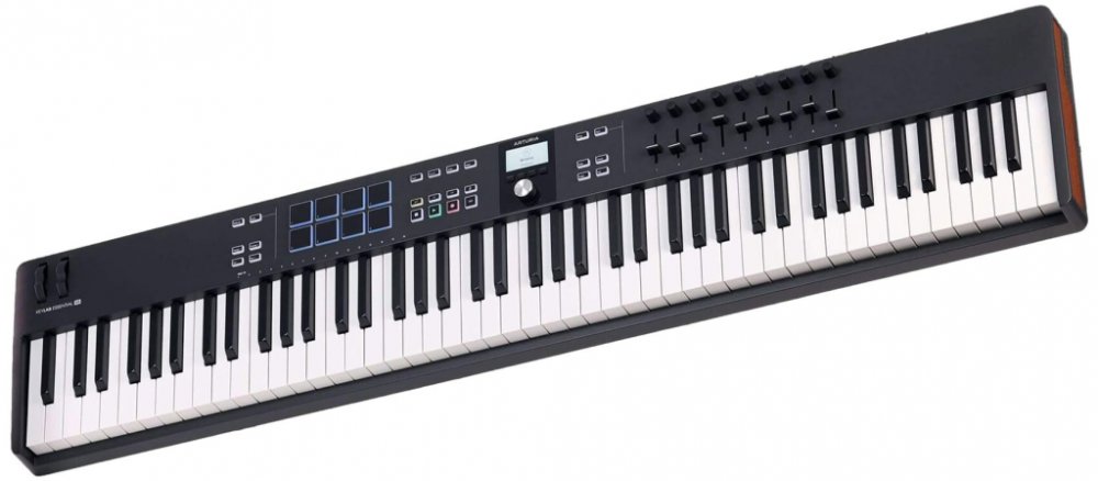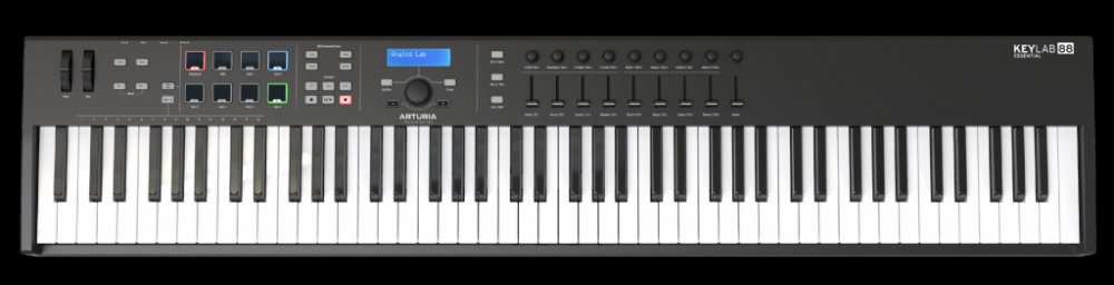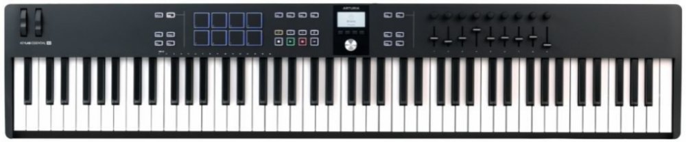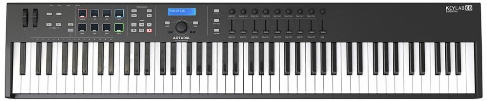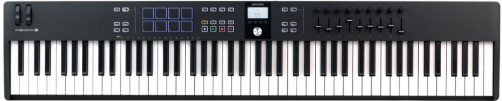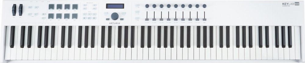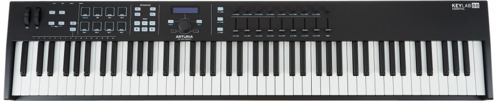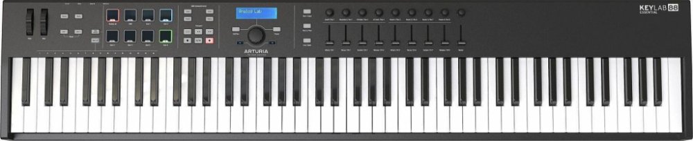 USB/MIDI keyboard Arturia Keylab Essential 88 je naprosto ideálním společníkem každého digitálního producenta. Kromě klaviatury je k dispozici řada ovládacích prvků pro plynulou práci, nabitý softwarový balíček a možnost použití bez počítače díky zdroji a MIDI konektivitě. I kdybyste byli naprostí začátečníci, díky dodávanému softwaru můžete s hudební produkcí začít ve velkém stylu. Oproti verzím se 49 a 61 klávesami obsahuje tento model navíc ovladače Pitch/Mod v podobě otočných koleček pro ještě větší flexibilitu. Analog Lab nabízí tisíce zvuků a 17 vintage nástrojů včetně simulací analogových syntezátorů, varhan, smyčců ad. UVI Grand Piano Model D je pečlivě vysamplovaný zvuk koncertního křídla Steinway D, které najdete v koncertních sálech po celém světě. Vašenápady ihned zaznamenáte pomocí DAW software a výkonného sekvencéru Ableton Live Lite, bez kterého se v současnosti neobejde snad žádný producent. K ovládání slouží dynamicky citlivá klaviatura včetně modulačního a pitch kolečka, performance ovladače pro kontrolu vašeho hudebního software, tlakově citlivé, podsvícené pady s nimiž spustíte samply a nasimulujete bicí nebo fadery a potenciometry pro kontrolu dalších parametrů virtuálních nástrojů. Mezi pokročilé funkce patří možnost výběru MIDI kanálu nebo přehledný displej. Pro propojení s počítačem slouží USB konektor, který kontrolér zároveň napájí. Nechcete-li si však zničit zrak u monitoru, díky konektoru pro adaptér a MIDI Out konektoru můžete ovládat externí syntezátory i samostatně. Pro dynamický přednes klavírních partů je k dispozici také vstup pro sustain pedál.