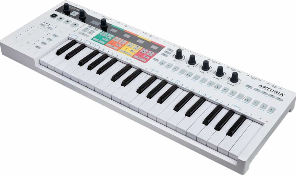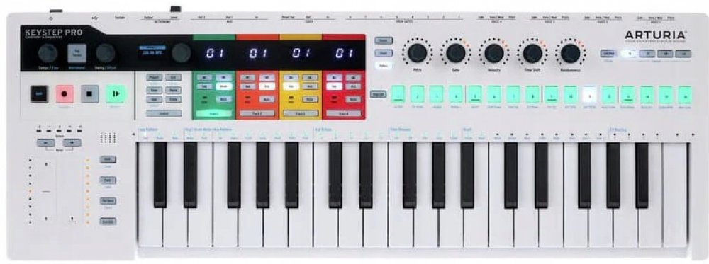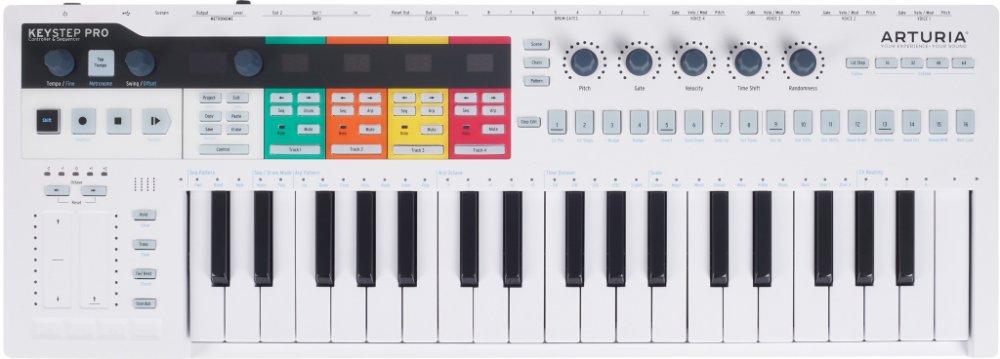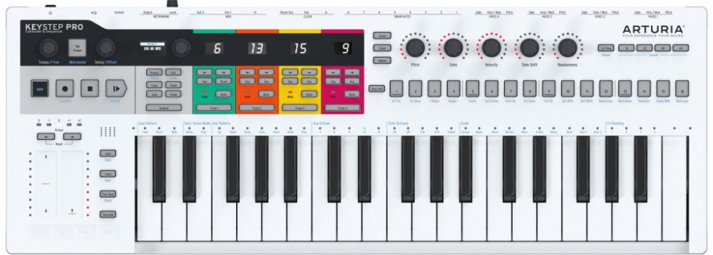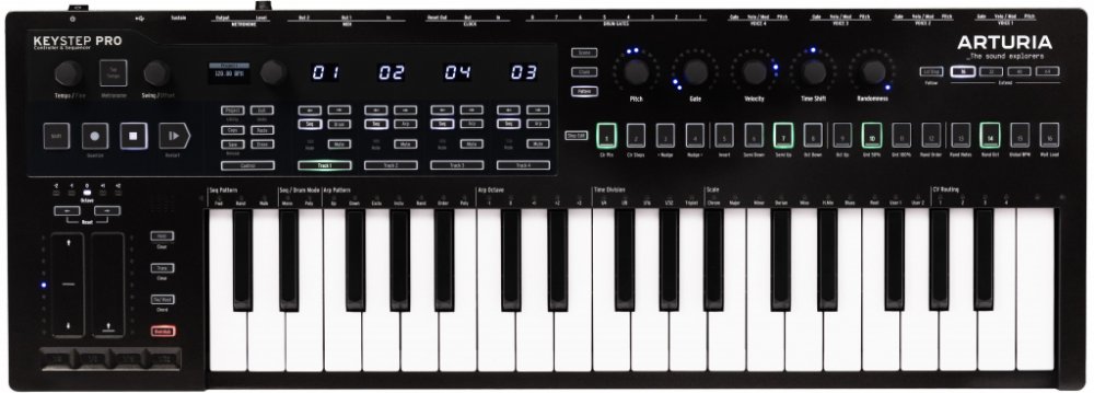 USB/MIDI keyboard, sekvencer Arturia představuje limitovanou černou edici populárního MIDI kontroléru Keystep Pro, který díky své rozsáhlé konektivitě a rozšířeným funkcím aspiruje na to, že se stane ovládacím centrem veškerého vašeho analogového i softwarového vybavení. Navíc má zabudovaný šestnáctikrokový sekvencer, čtyři nezávislé polyfonické sekvence, arpegiattor a klávesy, na které je radost hrát. Keystep Pro má 37 dynamicky citlivých Slim kláves s aftertouchem, jejichž velikost byla pečlivě vysoustružena tak, abyste při své hře nemuseli nic obětovat, ale nástroj si zachoval kompaktní rozměry. Každá klávesa navíc obsahuje LED diodu pro lepší orientaci. Nejeden hráč jistě ocení i zabudovaný sekvencer a arpeggiator. V režimu sekvenceru máte k dispozici až 64 kroků s polyfonií, na každý krok tak můžete použít celkem 16 tónů. Sekvence můžete měnit v reálném čase a pokud chcete hrát a sekvencovat zároveň, máte k dispozici dva samostatné MIDI kanály. Arpegiattor nabízí 7 různých módů rozkládání a rytmů, takže můžete rychle vytvořit vše od jednoduchých melodií až po totálně zmatené struktury. Barevně odlišená sekce pro ovládání čtyř stop vám výrazně ulehčí práci s jednotlivými stopami. Každá sekce disponuje dvouciferným displejem a ovládacím panelem pro co nejoptimálnější nastavení. Co činí Keystep Pro jedinečným kontrolérem je jeho rozšířená konektivita. Kromě standardního USB najdete i vstup a výstup pro MIDI, jacky pro synchronizaci hodin, DIN sync jacky, CV/Gate výstupy a samostatný CV výstup, kterému lze přiřadit ovladač Mod, dynamiku klaviatury nebo aftertouch. V praxi to znamená, že pomocí Keystepu můžete ovládat nejen software, ale i celou sbírku analogových syntezátorů a modulů, synchronizovat MIDI zařízení etc. USB port při připojení k počítači kontrolér nabíjí, pokud ho chcete používat samostatně, můžete připojit adaptér. Keystep Pro od firmy Arturia je jedinečným kontrolérem, který propojí vaše nejmodernější digitální přístroje s analogovým vybavením. Kontrolujte vše, co vás napadne a nenechte se při kreativním procesu ničím svazovat! Protiprachový kryt pro Arturia Keystep Pro: {1}