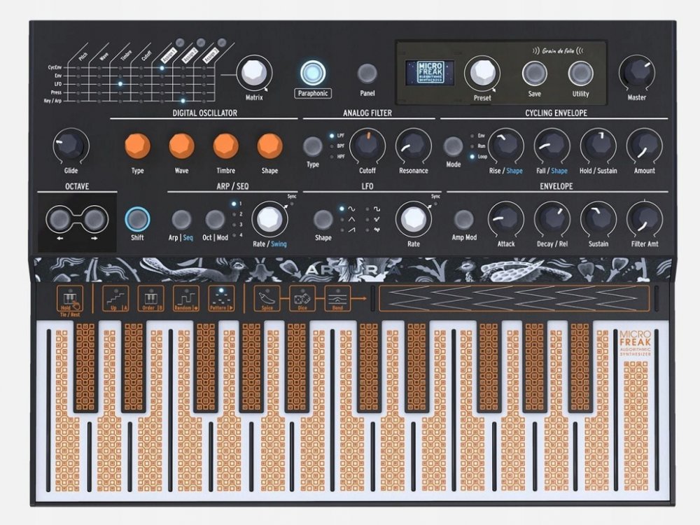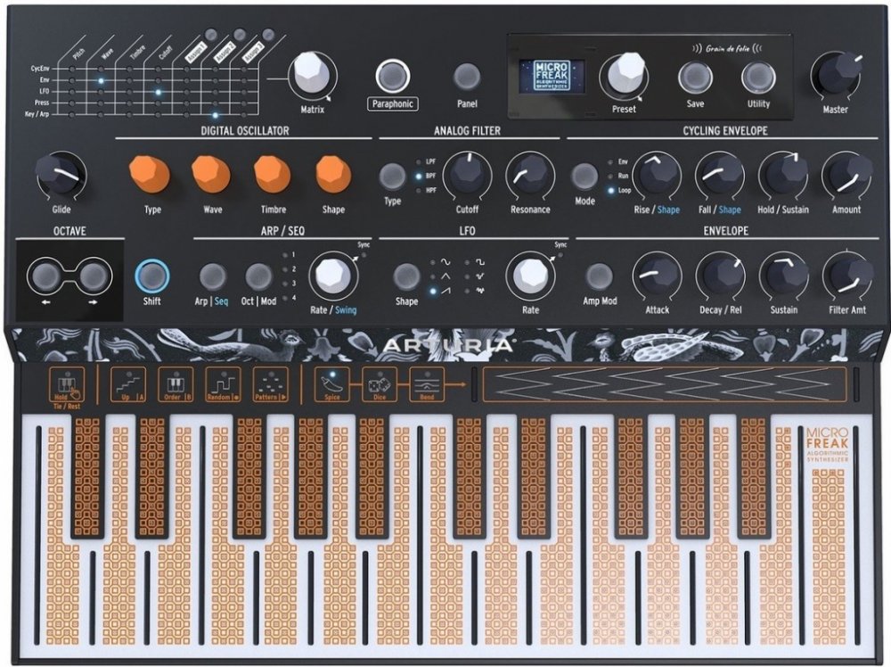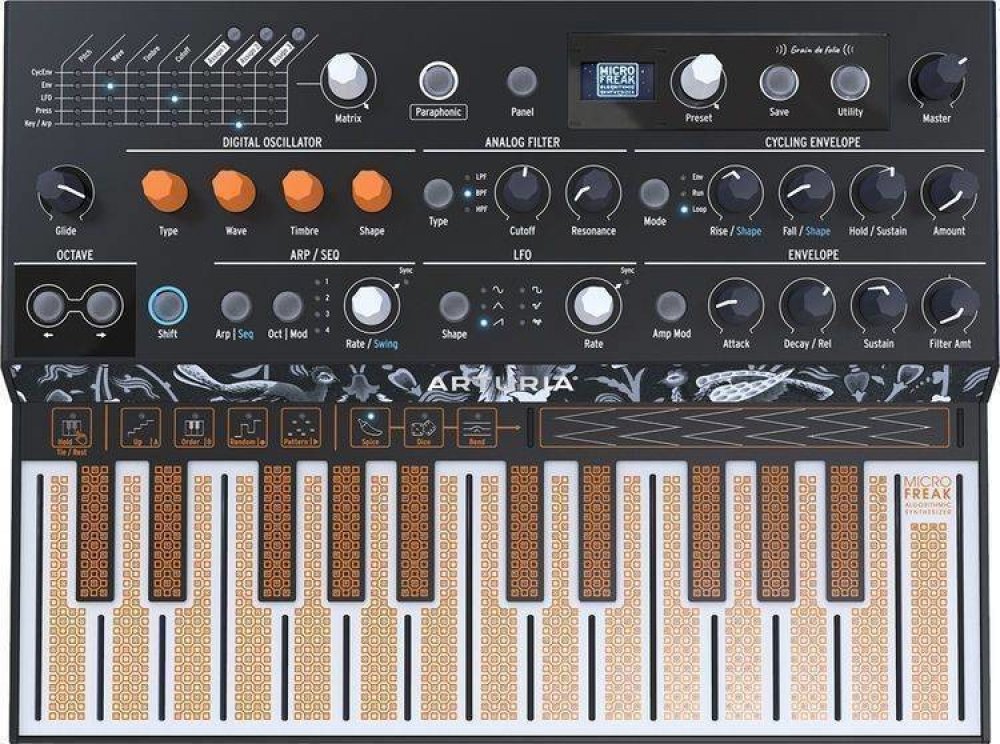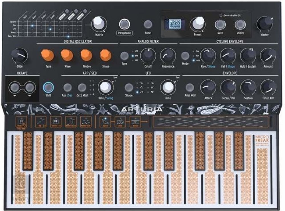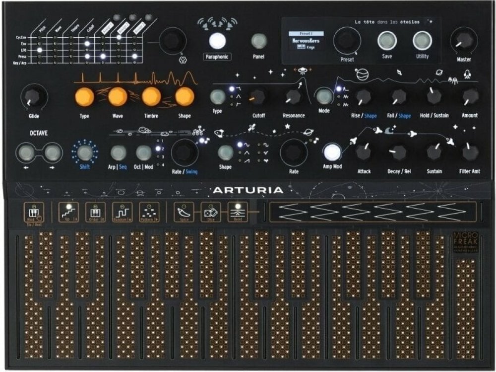 Syntezátor Arturia MicroFreak Stellar LE je limitovaná edice inovativního syntezátoru, který spojuje pokročilé možnosti práce se zvukem s jedinečným designem. Tento kompaktní syntezátor nabízí širokou škálu zvuků a možnosti tvorby, které rozšíří vaše hudební obzory. S aktualizovanou Stellar LE edicí přichází elegantní kosmický design ve tmavém provedení a se zářivými LED prstenci, které dodávají MicroFreaku výjimečný vzhled. Arturia MicroFreak je originální syntezátor s digitálními oscilátory, analogovým filtrem a zvuky z oblíbeného eurorack modulu Plaits od Mutable Instruments. Funguje v monofonním i parafonním režimu, zaujme plochou klaviaturou s polyfonním aftertouch a nepostrádá sekvencer, arpeggiator, modulační matrix ani pokročilé random funkce. V této cenové kategorii jde rozhodně o jeden z nejzajímavějších nástrojů. Jako základ pro tvorbu zvuku poslouží 11 digitálních oscilátorů (4 převzaté z Plaits), mezi nimiž nechybí klasické průběhy jako sinus, čtverec nebo pila, wavetable, karplus strong, FM syntéza a další. Zvuk pak dotvarujete analogovým variabilním filtrem vycházejícím z Oberheim SEM. Pro vytváření patternů je k dispozici sekvencer se 64 kroky a výkonný arpeggiator. Patterny můžete ozvláštnit pomocí funkcí Spice a Dice, které randomizují buď jednotlivé parametry nebo délku gate. Sekvence se tak budou neustále vyvíjet a nakopnou vaší inspiraci. Klaviatura není klaviaturou v pravém slova smyslu, ale plošný spoj. O rychlost ani expresivitu se však obávat nemusíte. Klávesy jsou dynamicky citlivé a mají polyfonní aftertouch, takže každá klávesa může modulovat jiný parametr. Pokud by vám chybělo tradiční ovládání, na zadním panelu najdete USB, MIDI a CV vstupy, pomocí nichž Microfreak snadno propojíte s oblíbeným kontrolérem, sekvencerem, DAW nebo třeba modulárním syntezátorem. Arturia Microfreak nabízí po zvukové i konstrukční stránce unikátní design a obstojí dobře jako první syntezátor i jako cenný kousek do sbírky každého synth geeka. Protiprachový kryt pro Arturia Microfreak: {1}