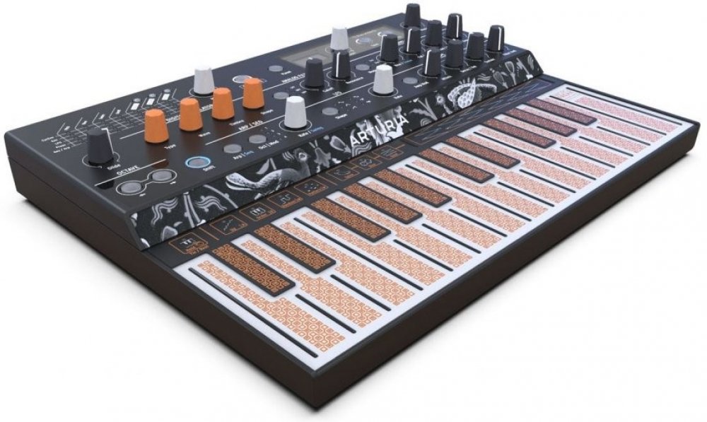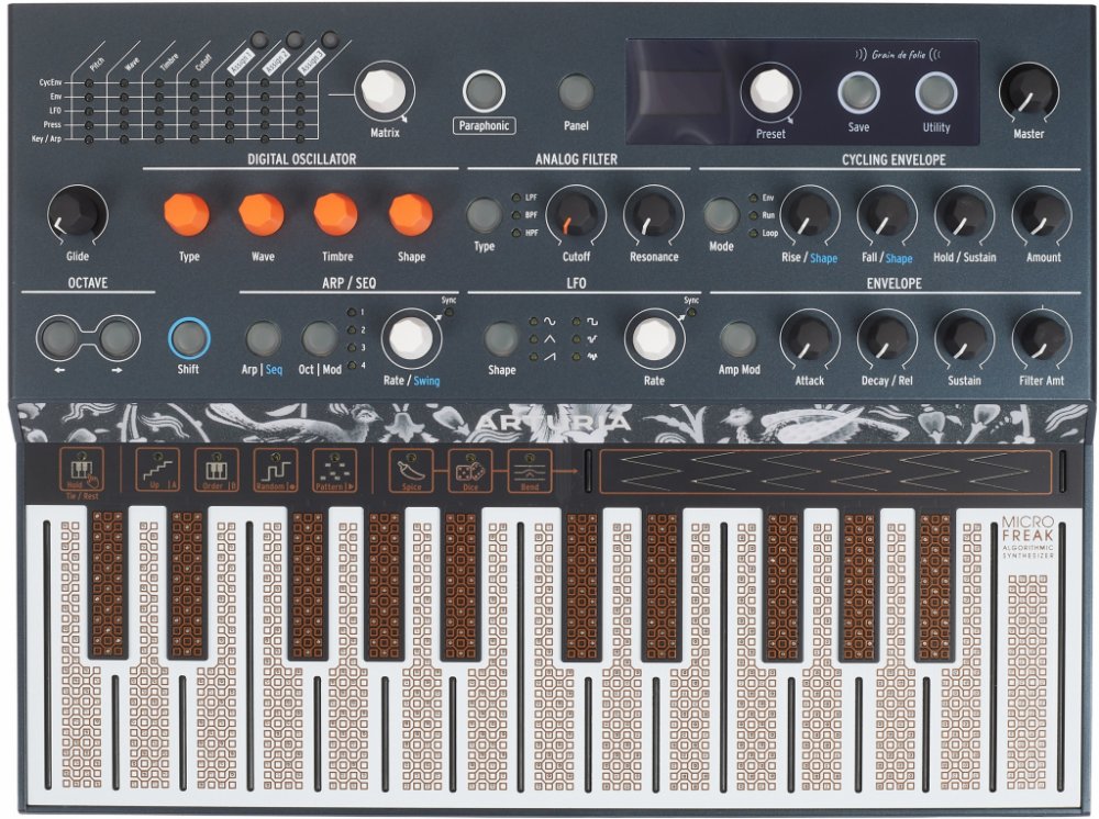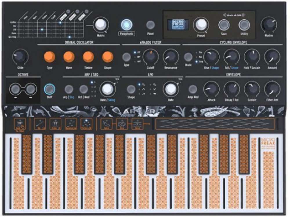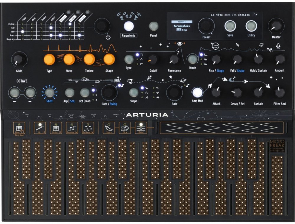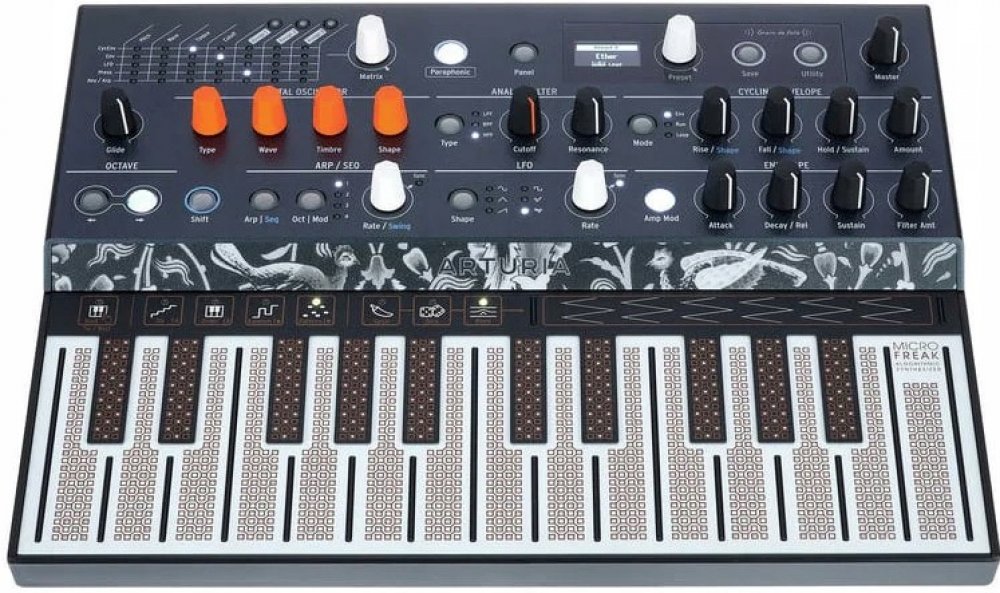 Syntezátor Arturia MicroFreak Stellar LE je limitovaná edice inovativního syntezátoru, který spojuje pokročilé možnosti práce se zvukem s jedinečným designem. Tento kompaktní syntezátor nabízí širokou škálu zvuků a možnosti tvorby, které rozšíří vaše hudební obzory. S aktualizovanou Stellar LE edicí přichází elegantní kosmický design ve tmavém provedení a se zářivými LED prstenci, které dodávají MicroFreaku výjimečný vzhled. Arturia MicroFreak je originální syntezátor s digitálními oscilátory, analogovým filtrem a zvuky z oblíbeného eurorack modulu Plaits od Mutable Instruments. Funguje v monofonním i parafonním režimu, zaujme plochou klaviaturou s polyfonním aftertouch a nepostrádá sekvencer, arpeggiator, modulační matrix ani pokročilé random funkce. V této cenové kategorii jde rozhodně o jeden z nejzajímavějších nástrojů. Jako základ pro tvorbu zvuku poslouží 11 digitálních oscilátorů (4 převzaté z Plaits), mezi nimiž nechybí klasické průběhy jako sinus, čtverec nebo pila, wavetable, karplus strong, FM syntéza a další. Zvuk pak dotvarujete analogovým variabilním filtrem vycházejícím z Oberheim SEM. Pro vytváření patternů je k dispozici sekvencer se 64 kroky a výkonný arpeggiator. Patterny můžete ozvláštnit pomocí funkcí Spice a Dice, které randomizují buď jednotlivé parametry nebo délku gate. Sekvence se tak budou neustále vyvíjet a nakopnou vaší inspiraci. Klaviatura není klaviaturou v pravém slova smyslu, ale plošný spoj. O rychlost ani expresivitu se však obávat nemusíte. Klávesy jsou dynamicky citlivé a mají polyfonní aftertouch, takže každá klávesa může modulovat jiný parametr. Pokud by vám chybělo tradiční ovládání, na zadním panelu najdete USB, MIDI a CV vstupy, pomocí nichž Microfreak snadno propojíte s oblíbeným kontrolérem, sekvencerem, DAW nebo třeba modulárním syntezátorem. Arturia Microfreak nabízí po zvukové i konstrukční stránce unikátní design a obstojí dobře jako první syntezátor i jako cenný kousek do sbírky každého synth geeka. Protiprachový kryt pro Arturia Microfreak: {1}