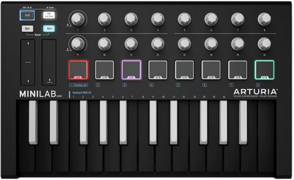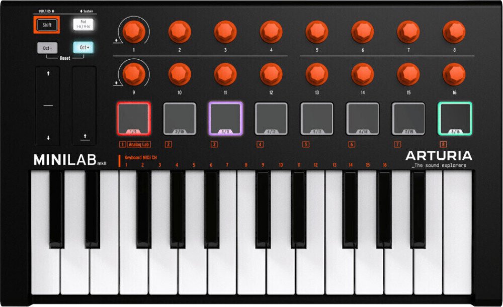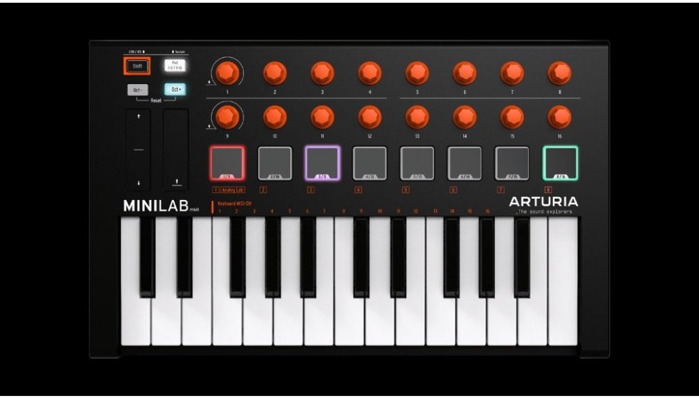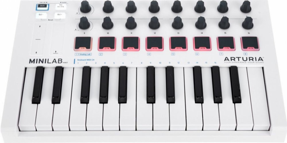Univerzální přenosný MIDI kontroler s dodávaným softwarem Analog Lab Lite, Ableton Live Lite a UVI Grand (Steinway Model D piano).