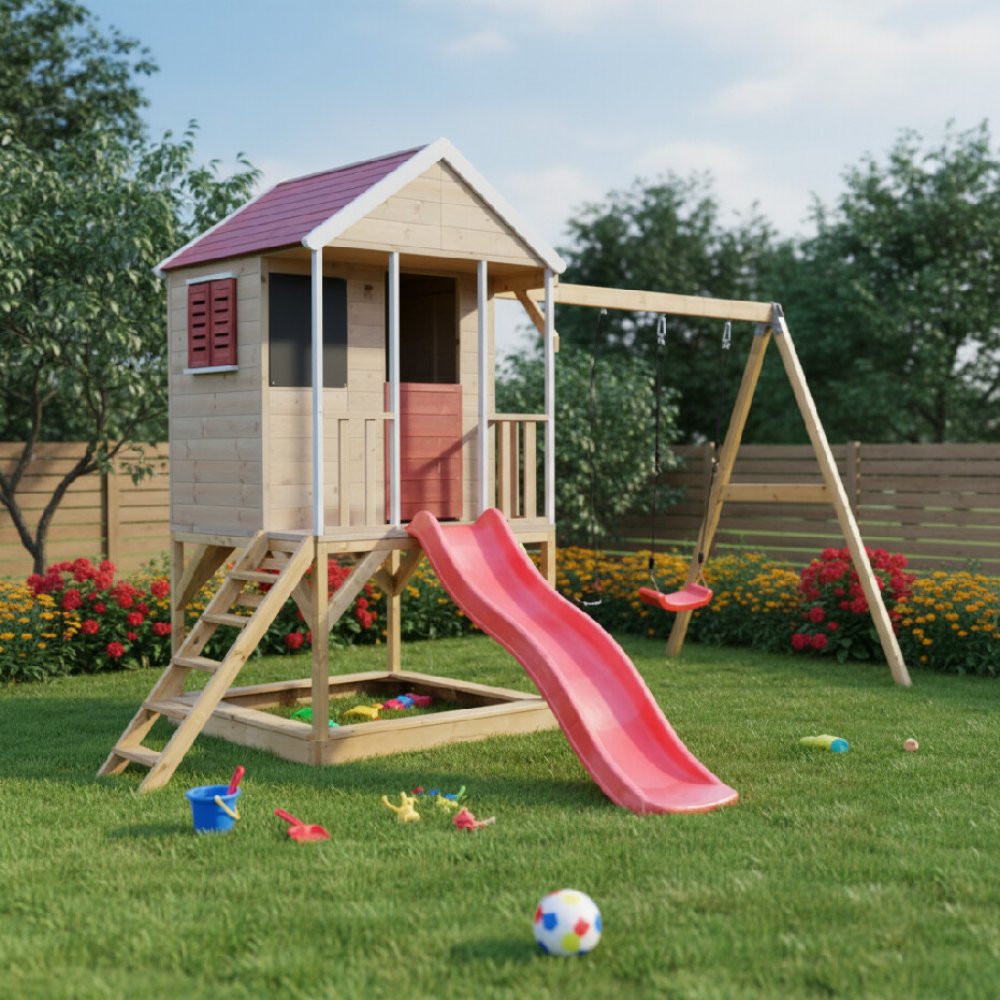 Dětský zahradní set CHILDHOOD sestává z vyvýšeného dřevěného domku , který je vybaven krytou terasou, dveřmi a okénky s okenicemi. Do domku se lze dostat pevnými žebříkovými schody . Pro ještě větší zábavu je domeček vybaven skluzavkou dlouhou 175 cm a houpačkou . Prostor pod domek můžete využít na pískoviště , desky mohou posloužit jako sezení při hře. Vaše děti určitě zaujme tabule umístěná u vchodu .