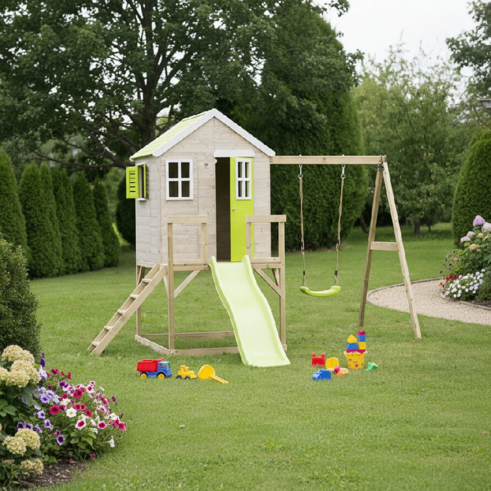 Dětský zahradní set sestává z vyvýšeného dřevěného domku , který je vybaven balkonem, dveřmi a okénky se žaluziemi. Do domku se lze dostat pevnými žebříkovými schody . Pro ještě větší zábavu je domeček vybaven skluzavkou dlouhou 175 cm a houpačkou . Díky vkusnému designu , přírodním barvám a mnoha hravým komponentům bude toto dětský domeček s hřištěm skvělým místem pro dostatek krásných chvil se svými kamarády a rodiči. Domeček nevyžaduje speciální údržbu . Může být ošetřen ochranným prostředkem na dřevo jednou ročně, aby byl zdravější. Hřiště si může zákazník snadno složit doma bez potřeby dalších upevnění nebo jakéhokoli speciálního nářadí. Podrobné a jednoduché pokyny pro instalaci a údržbu krok za krokem jsou přeloženy ve více jazycích.