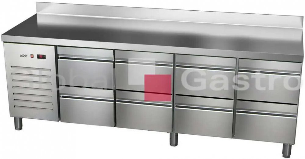 Robustní pracovní desky z nerezové oceli o tloušťce 50 mm se 100 mm vysokým zpětným dostřikem jako standardní volitelná výbava, která zabraňuje rozlití za pultem. Přizpůsobení je k dispozici v různých konfiguracích (bez stříkání, bez horní části, s dřezem a materiály (nerezová ocel, žula), aby se přizpůsobily jakýmkoli profesionálním kuchyňským potřebám.